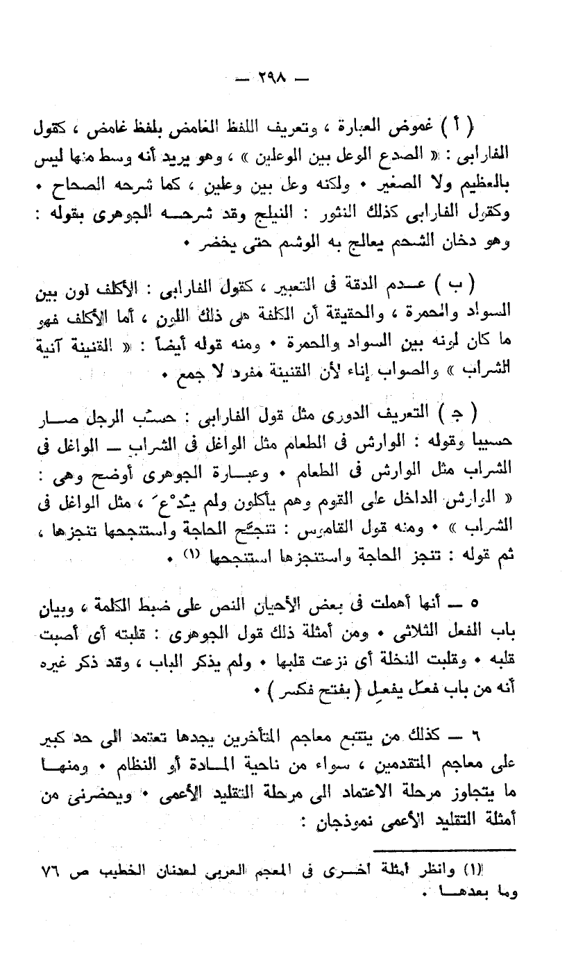 أ- غموض العبارة، وتعريف اللفظ الغامض بلفظ غامض، كقول الفارابي: "الصدع الوعل بين الوعلين"، وهو يريد أنه وسط منها ليس بالعظيم ولا الصغير. ولكنه وعل بين وعلين، كما شرحه الصحاح. وكقول الفارابي كذلك النثور: النيلج وقد شرحه الجوهري بقوله: وهو دخان الشحم يعالج به الوشم حتى يخضر.