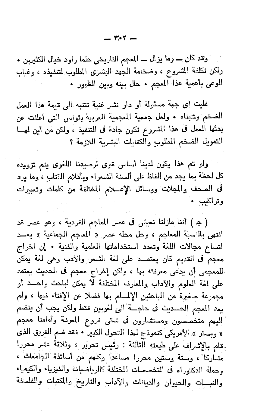 جـ- إننا ما زلنا نعش في عصر المعاجم الفردية، وهو عصر قد انتهى بالنسبة للمعاجم، وحل محله عصر "المعاجم الجماعية" بعد اتساع مجالات اللغة وتعدد استخداماتها العلمية والفنية. إن إخراج معجم في القديم كان يعتمد على لغة الشعر والأدب وهي لغة يمكن للمعجمي أن يدعي معرفته بها، ولكن إخراج معجم في الحديث يعتمد على لغة العلوم والآداب والمعارف المختلفة لا يمكن لباحث واحد أو مجموعة صغيرة من الباحثين الإلمام بها فضلًا عن الإفتاء فيها، ولم يعد المعجم الحديث في حاجة إلى لغويين فقط ولكن يجب أن ينضم إليهم متخصصون ومستشارون في شتى فروع المعرفة وأمامنا معجم "ويستر" الأمريكي كنموذج لهذا التحول الكبير. فقد ضم الفريق الذي قام بالإشراف على طبعته الثالثة: رئيس تحرير، وثلاثة عشر محررًا مشاركًا، وستة وستين محررًا مساعدًا وكلهم من أساتذة الجامعات، وحملة الدكتوراه في التخصصات المختلفة كالرياضيات والفيزياء والكيمياء والنبات والحيوان والديانات والآداب والتاريخ والمكتبات والفلسفة