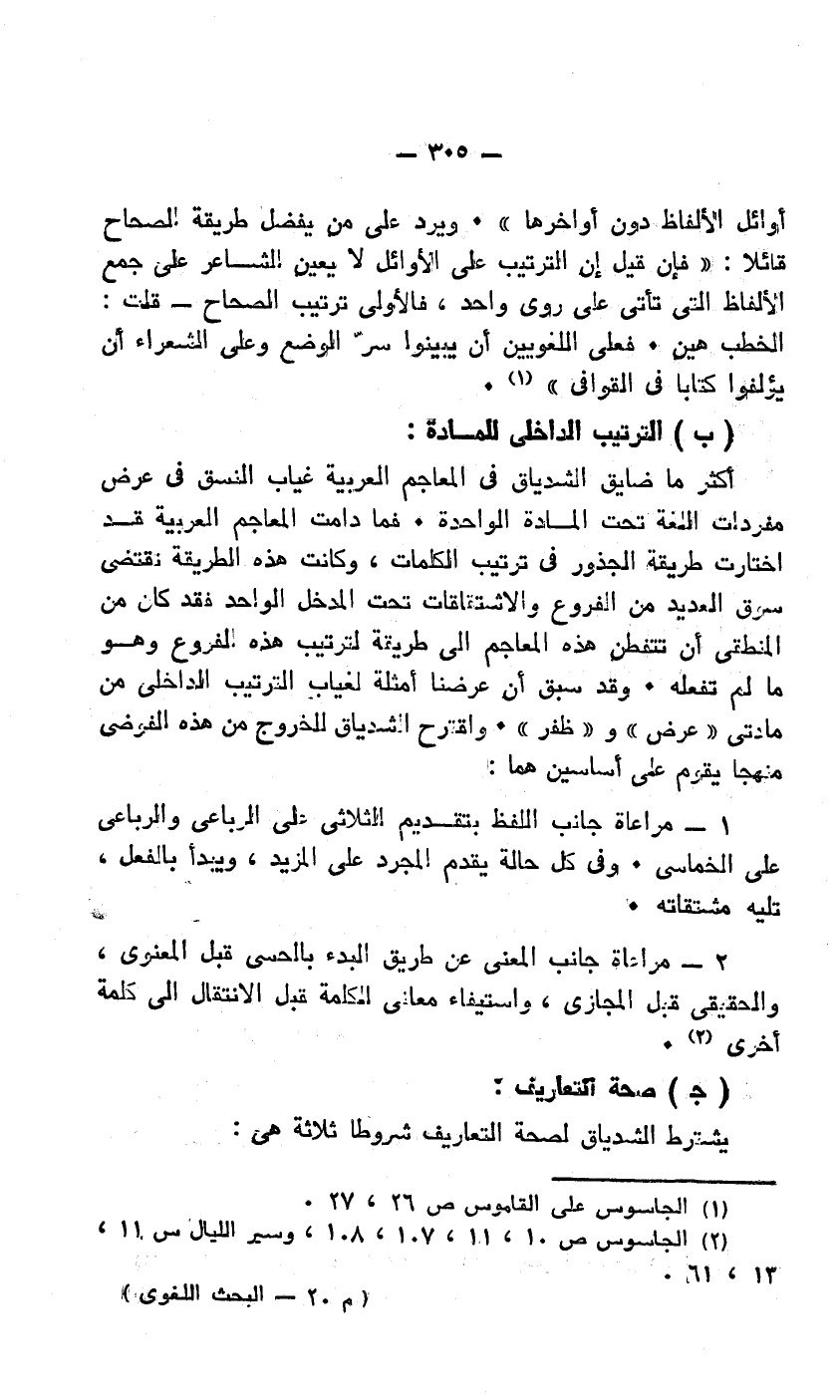 أوائل الألفاظ دون أواخرها". ويرد على من يفضل طريقة الصحاح قائلًا: "فإن قيل: إن الترتيب على الأوائل لا يعين الشاعر على جمع الألفاظ التي تأتي على روي واحد، فالأولى ترتيب الصحاح - قلت: الخطب هين. فعلى اللغويين أن يبينوا سر الوضع وعلى الشعراء أن يؤلفوا كتابًا في القوافي"1.