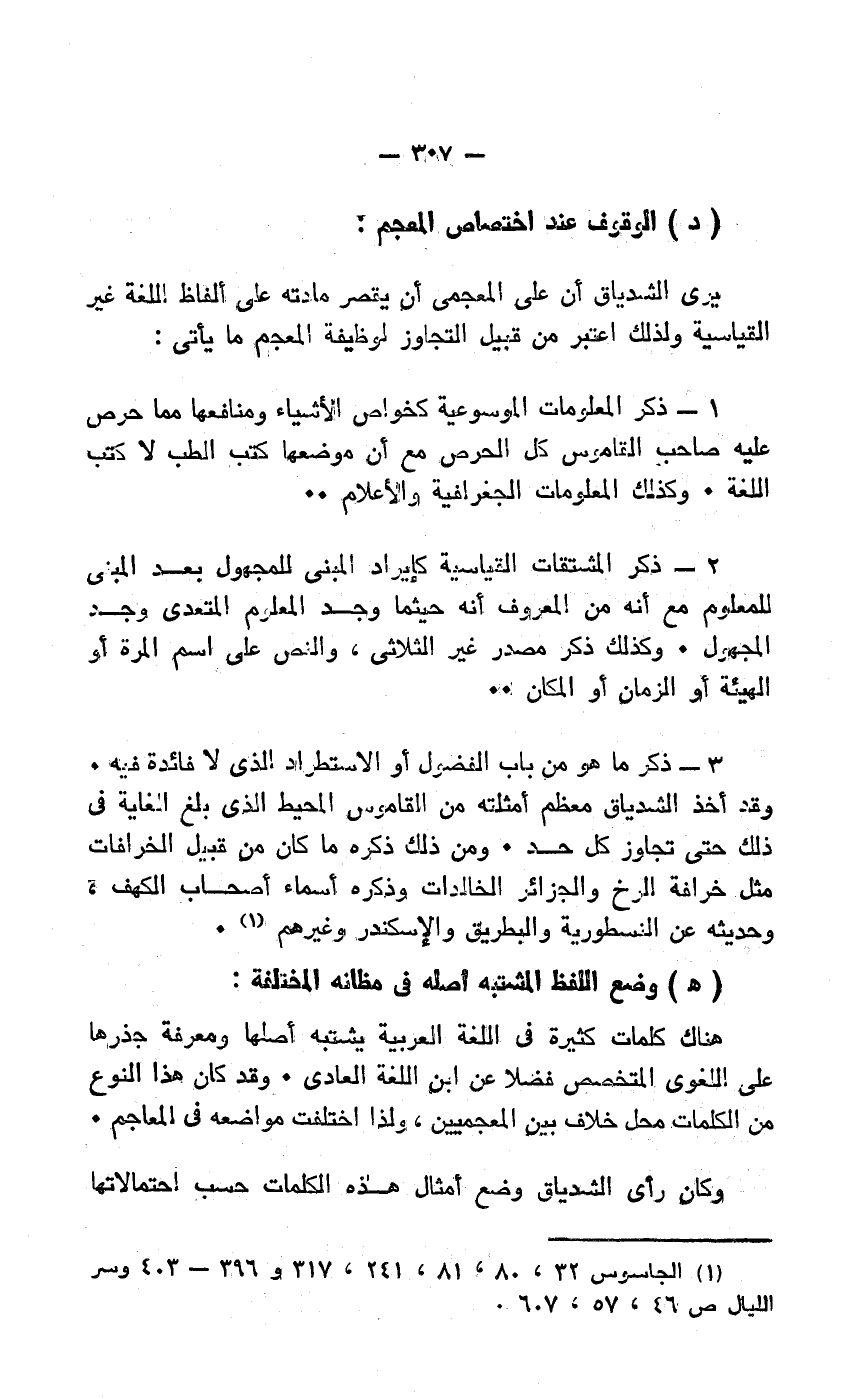 يرى الشدياق أن على المعجمي أن يقصر مادته على ألفاظ اللغة غير القياسية ولذلك اعتبر من قبيل التجاوز لوظيفة المعجم ما يأتي: