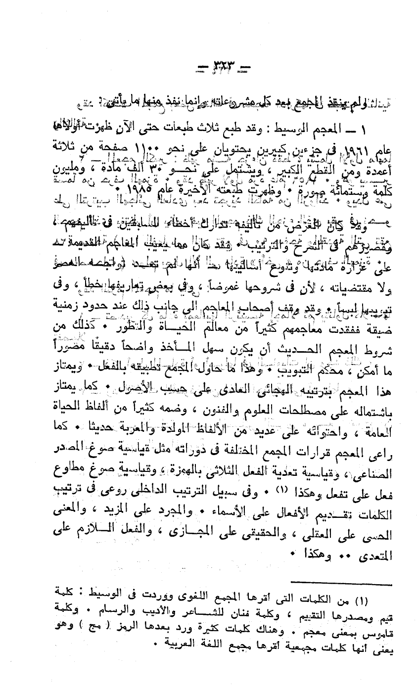 1- المعجم الوسيط: وقد طبع ثلاث طبعات حتى الآن ظهرت أولاها عام 1961 في جزءين كبيرين يحتويان على نحو 1100 صفحة من ثلاثة أعمدة ومن القطع الكبير، ويشتمل على نحو 30 ألف مادة، ومليون كلمة وستمائة صورة. وظهرت طبعته الأخيرة عام 1985.