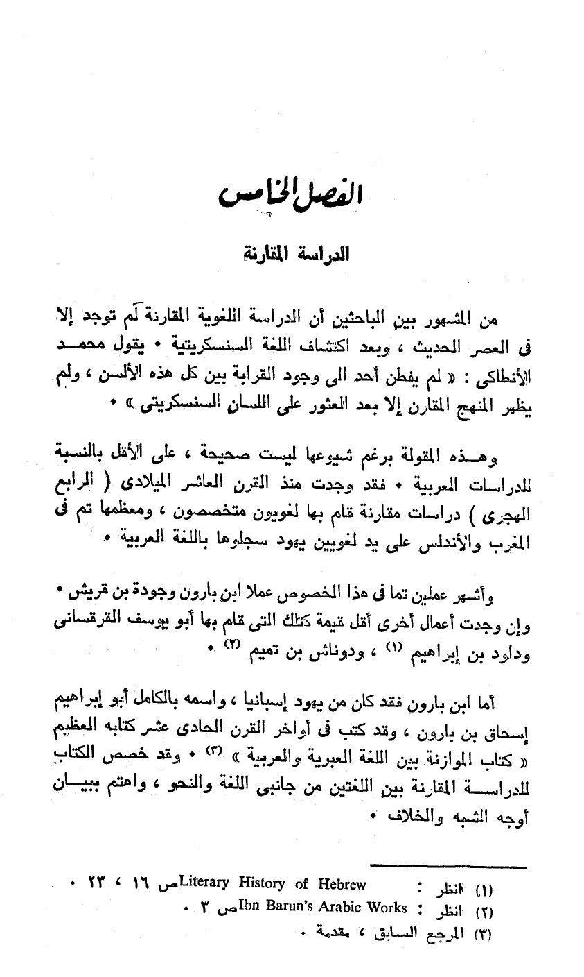 أما ابن بارون فقد كان من يهود إسبانيا، واسمه بالكامل أبو إبراهيم إسحاق بن بارون، وقد كتب في أواخر القرن الحادي عشر كتابه العظيم "كتاب الموازنة بين اللغة العبرية والعربية"3. وقد خصص الكتاب للدراسة المقارنة بين اللغتين من جانبي اللغة والنحو، واهتم ببيان أوجه الشبه والخلاف.
