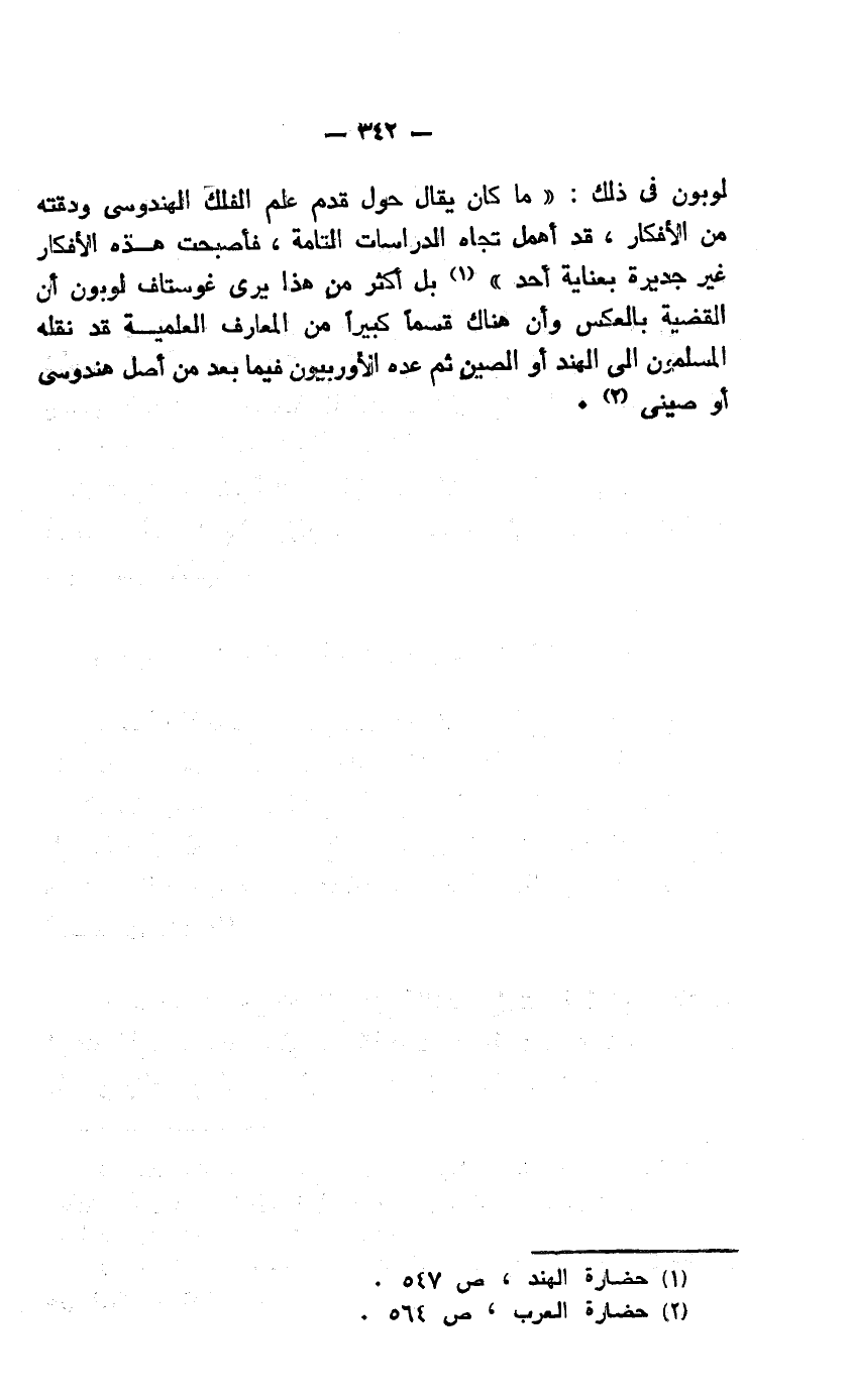لوبون في ذلك: "ما كان يقال حول قدم علم الفلك الهندوسي ودقته من الأفكار، قد أهمل تجاه الدراسات التامة، فأصبحت هذه الأفكار غير جديرة بعناية أحد"1 بل أكثر من هذا يرى غوستاف لوبون أن القضية بالعكس وأن هناك قسمًا كبيرًا من المعارف العلمية قد نقله المسلمون إلى الهند أو الصين ثم عده الأوربيون فيما بعد من أصل هندوسي أو صيني2.