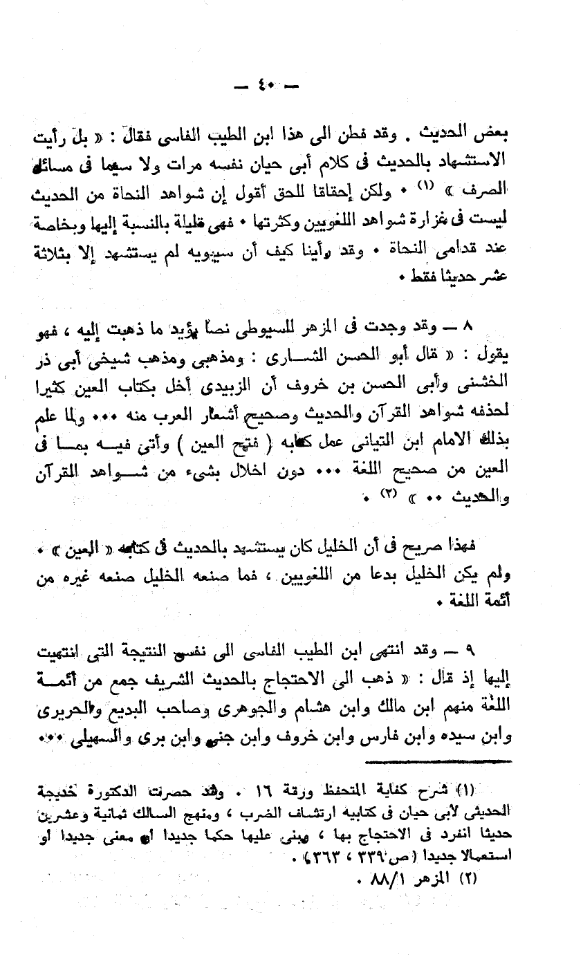9- وقد انتهى ابن الطيب الفاسي إلى نفس النتيجة التي انتهيت إليها إذ قال: "ذهب إلى الاحتجاج بالحديث الشريف جمع من أئمة اللغة منهم ابن مالك وابن هشام والجوهري وصاحب البديع والحريري وابن سيده وابن فارس وابن خروف وابن جني وابن بري والسهيلي....