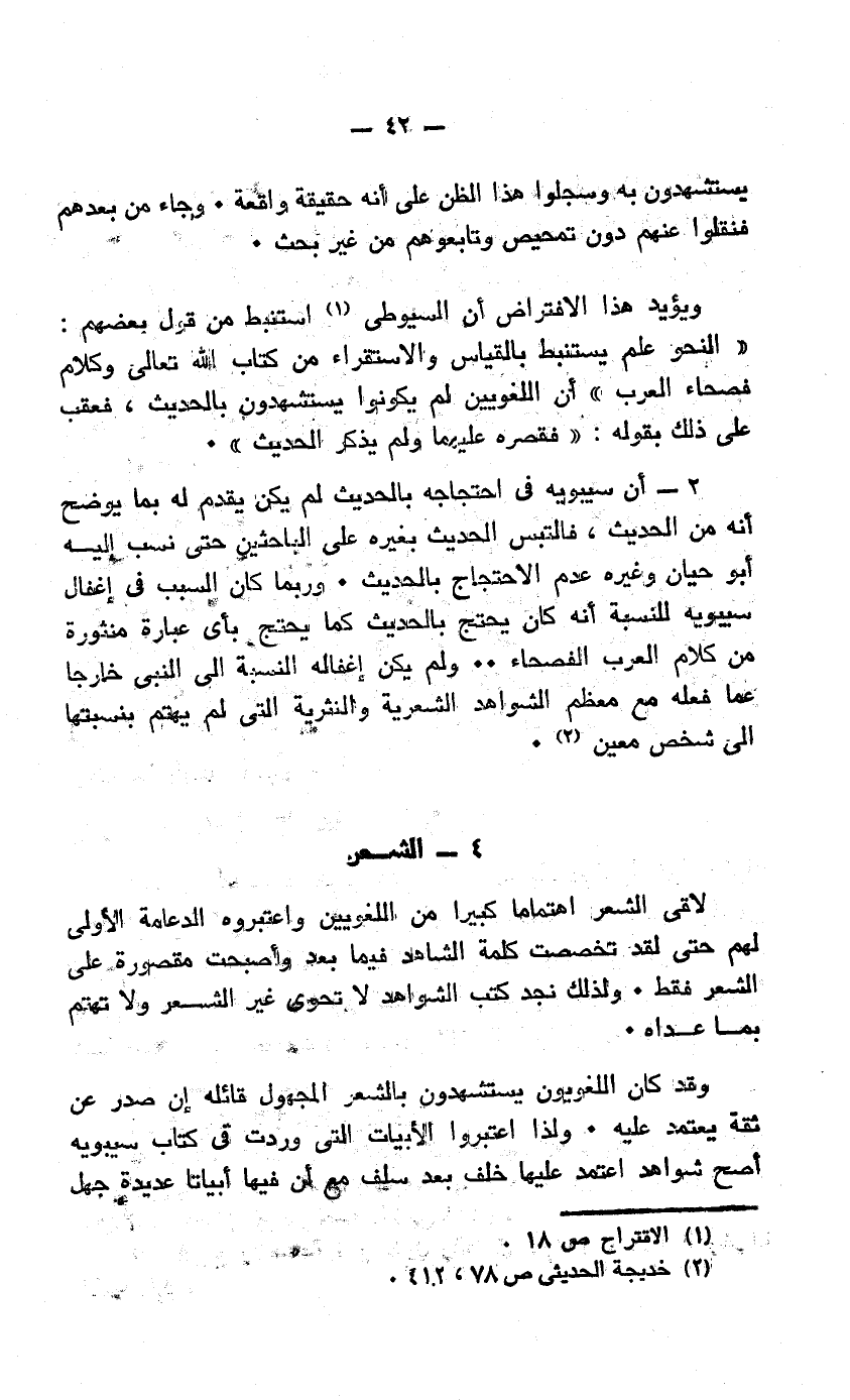 "النحو علم يستنبط بالقياس والاستقراء من كتاب الله تعالى وكلام فصحاء العرب" أن اللغويين لم يكونوا يستشهدون بالحديث، فعقب على ذلك بقوله: "فقصره عليهما ولم يذكر الحديث".