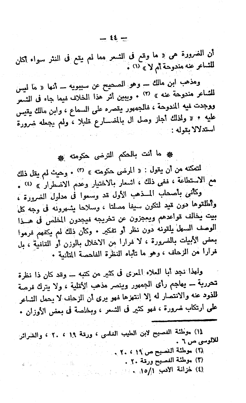 ولهذا نجد أبا العلاء المعري في كثير من كتبه -وقد كان ذا نظرة تحررية- يهاجم رأي الجمهور وينصر مذهب الأقلية، ولا يترك فرصة للذود عنه والانتصار له إلا انتهزها فهو يرى أن الزحاف لا يحمل الشاعر على ارتكاب ضرورة، فهو كثير في الشعر، وبخاصة في بعض الأوزان.