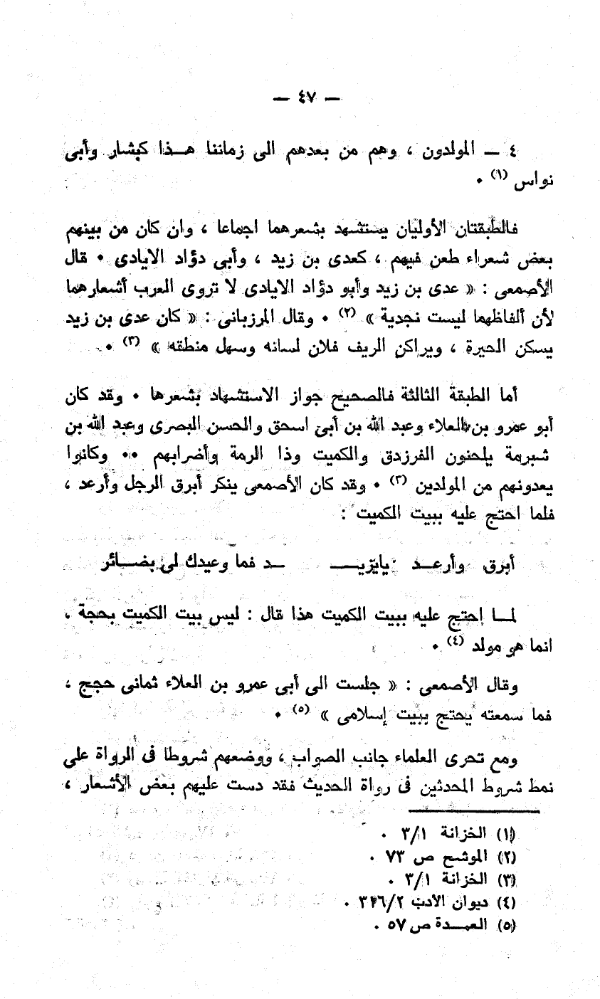 أما الطبقة الثالثة فالصحيح جواز الاستشهاد بشعرها. وقد كان أبو عمرو بن العلاء وعبد الله بن أبي إسحاق والحسن البصري وعبد الله بن شبرمة يلحنون الفرزدق والكميت وذا الرمة وأضرابهم.. وكانوا يعدونهم من المولدين3. وقد كان الأصمعي ينكر أبرق الرجل وأرعد، فلما احتج عليه ببيت الكميت: