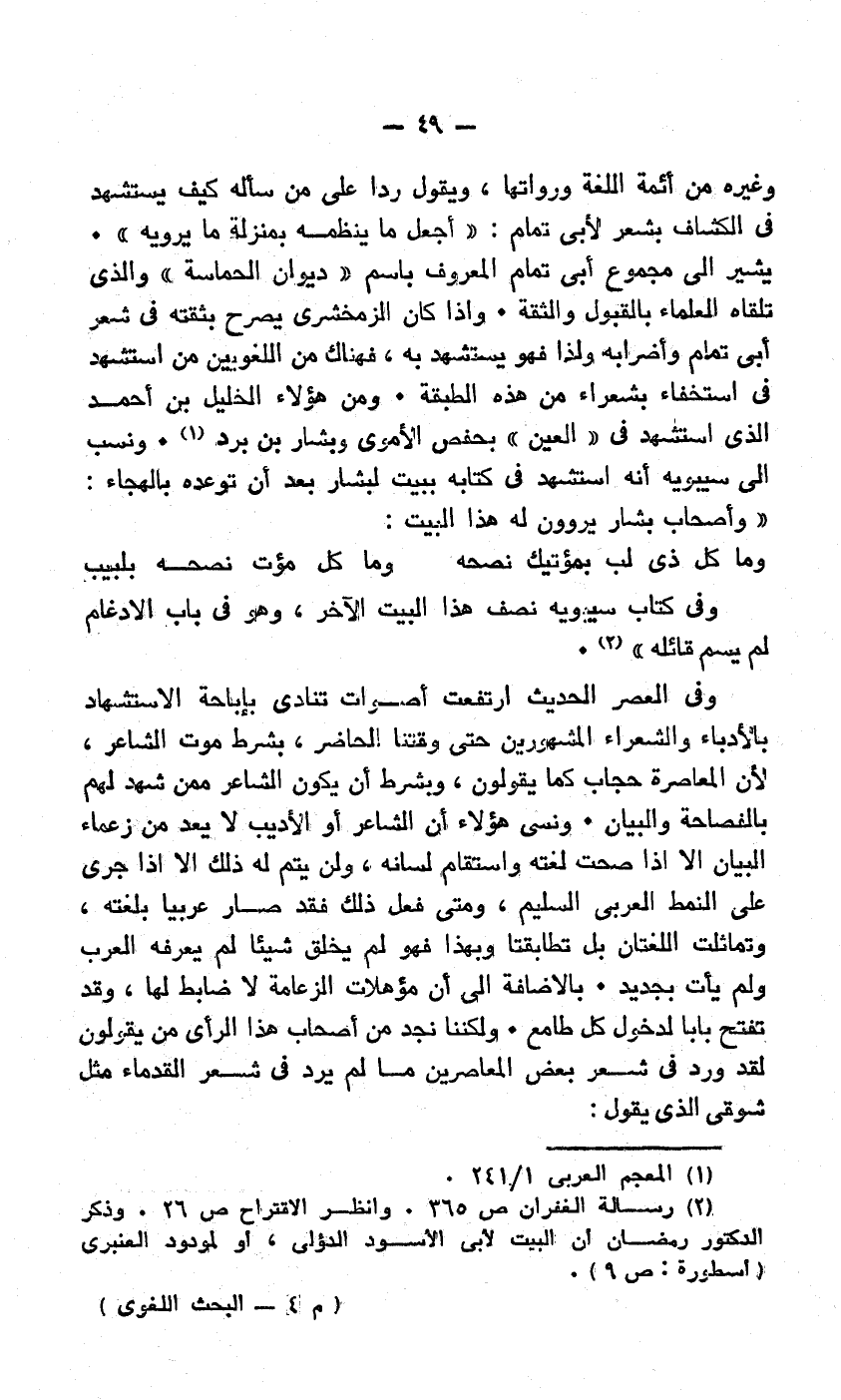 يشير إلى مجموع أبي تمام المعروف باسم "ديوان الحماسة" والذي تلقاه العلماء بالقبول والثقة. وإذا كان الزمخشري يصرح بثقته في شعر أبي تمام وأضرابه ولذا فهو يستشهد به، فهناك من اللغويين من استشهد في استخفاء بشعراء من هذه الطبقة. ومن هؤلاء الخليل بن أحمد الذي استشهد في "العين" بحفص الأموي وبشار بن برد1. ونسب إلى سيبويه أنه استشهد في كتابه ببيت لبشار بعد أن توعده بالهجاء. "وأصحاب بشار يروون له هذا البيت: