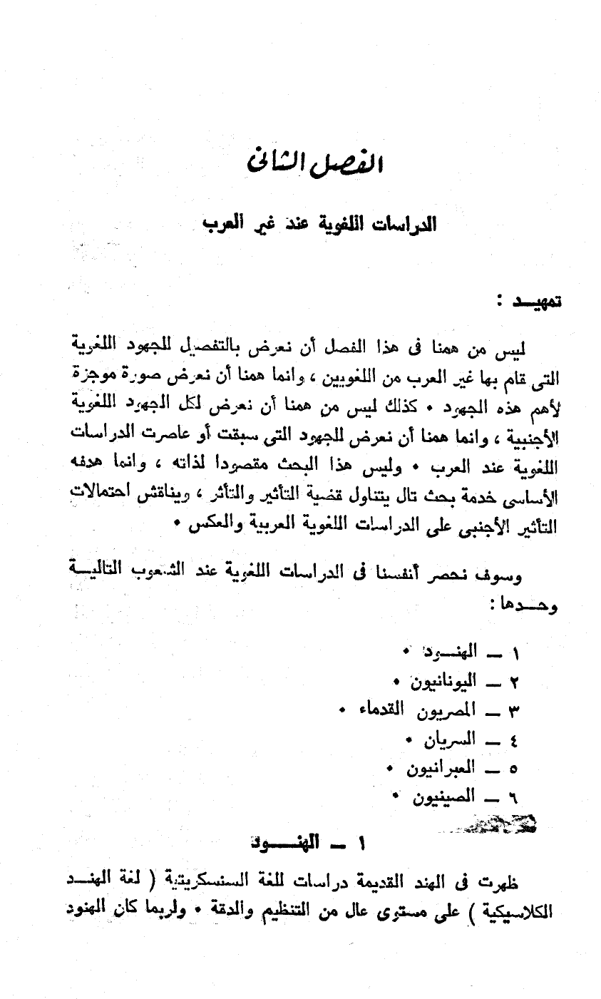 ليس من همنا في هذا الفصل أن نعرض بالتفصيل للجهود اللغوية التي قام بها غير العرب من اللغويين، وإنما همنا أن نعرض صورة موجزة لأهم هذه الجهود. كذلك ليس من همنا أن نعرض لكل الجهود اللغوية الأجنبية، وإنما همنا أن نعرض للجهود التي سبقت أو عاصرت الدراسات اللغوية عند العرب: وليس هذا البحث مقصودًا لذاته، وإنما هدفه الأساسي خدمة بحث تال يتناول قضية التأثير والتأثر، ويناقش احتمالات التأثير الأجنبي على الدراسات اللغوية العربية والعكس.