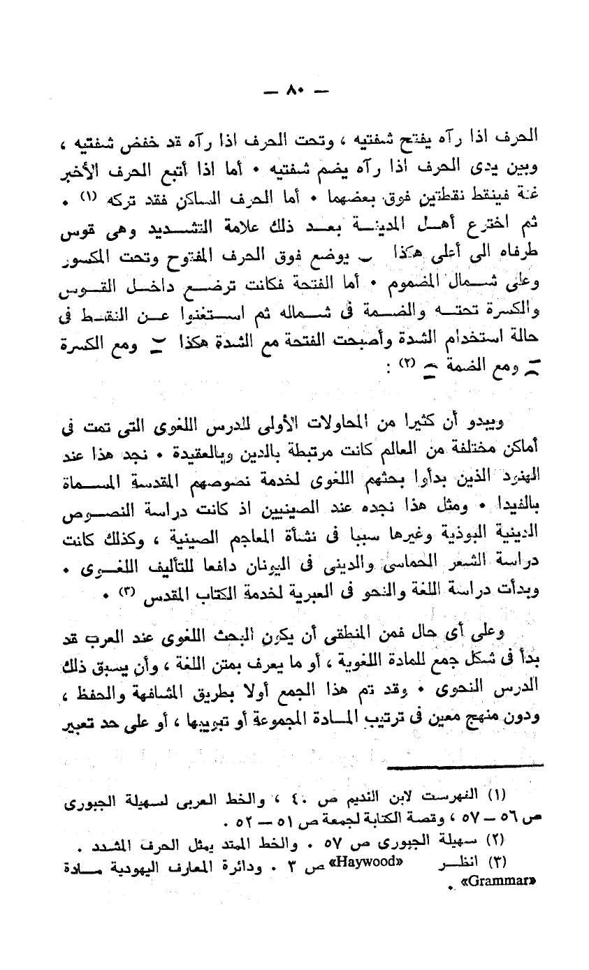 ويبدو أن كثيرًا من المحاولات الأولى للدرس اللغوي التي تمت في أماكن مختلفة من العالم كانت مرتبطة بالدين وبالعقيدة. نجد هذا عند الهنود الذين بدأوا بحثهم اللغوي لخدمة نصوصهم المقدسة المسماة بالفيدا. ومثل هذا نجده عند الصينيين إذا كانت دراسة النصوص الدينية البوذية وغيرها سببًا في نشأة المعاجم الصينية، وكذلك كانت دراسة الشعر الحماسي والديني في اليونان دافعًا للتأليف اللغوي.