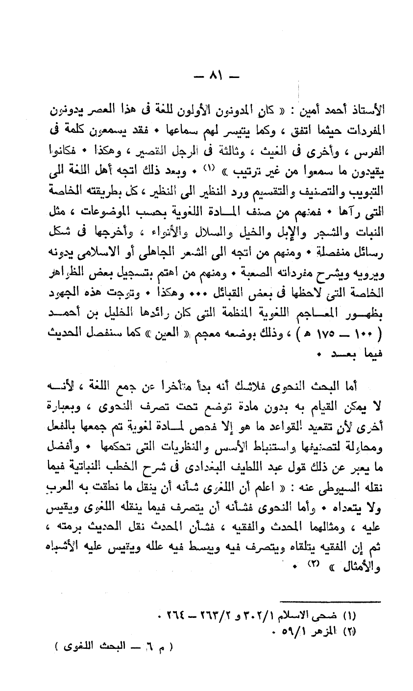 الأستاذ أحمد أمين: "كان المدونون الأولون للغة في هذا العصر يدونون المفردات حيثما اتفق، وكما يتيسر لهم سماعها. فقد يسمعون كلمة في الفرس، وأخرى في الغيث، وثالثة في الرجل القصير، وهكذا. فكانوا يقيدون ما سمعوا من غير ترتيب"1.