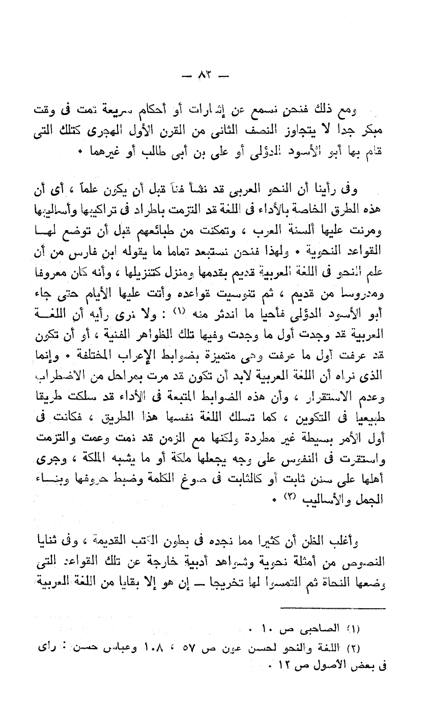 ولهذا فنحن نستبعد تمامًا ما يقوله ابن فارس من أن علم النحو في اللغة العربية قديم بقدمها ومنزل كتنزيلها، وأنه كان معروفًا ومدروسًا من قديم، ثم تنوسيت قواعده وأتت عليها الأيام حتى جاء أبو الأسود الدؤلي فأحيا ما اندثر منه1: ولا نرى رأيه أن اللغة العربية قد وجدت أول ما وجدت وفيها تلك الظواهر الفنية، أو أن تكون قد عرفت أول ما عرفت وهي متميزة بضوابط الإعراب المختلفة.