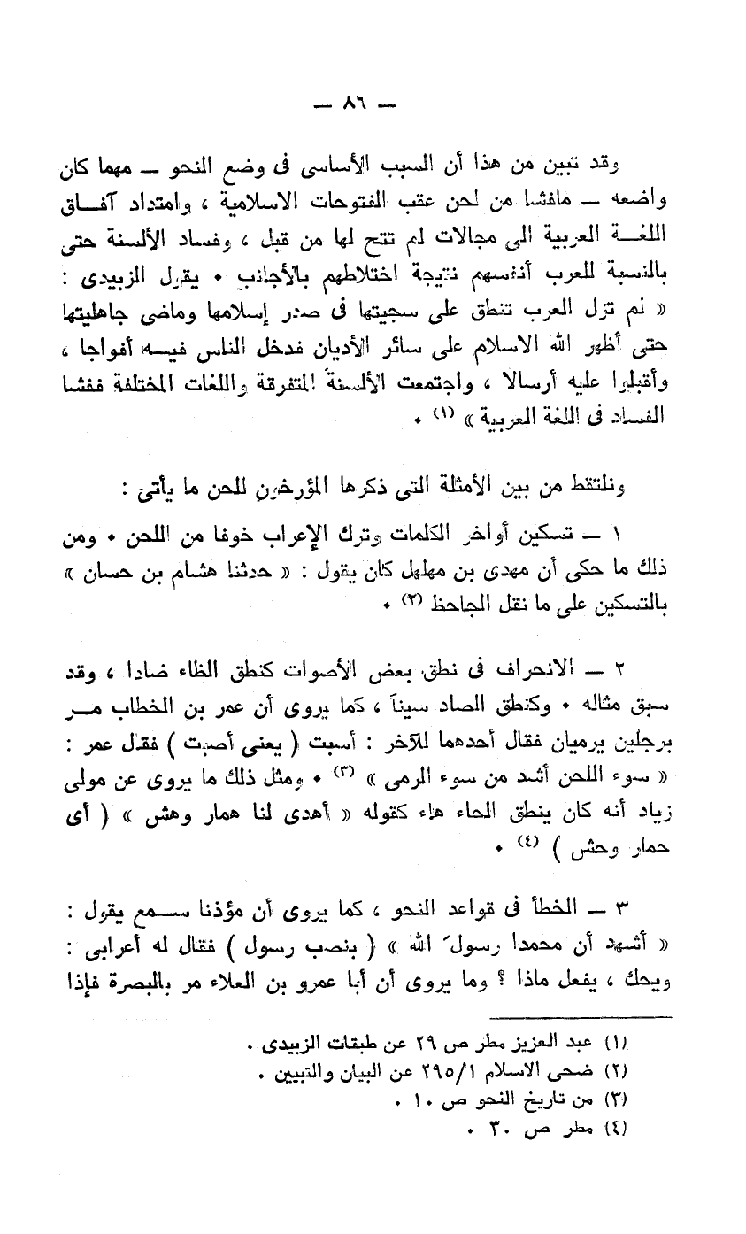 وقد تبين من هذا أن السبب الأساسي في وضع النحو -مهما كان واضعه- ما فشا من لحن عقب الفتوحات الإسلامية، وامتداد آفاق اللغة العربية إلى مجالات لم تتح لها من قبل، وفساد الألسنة حتى بالنسبة للعرب أنفسهم نتيجة اختلاطهم بالأجانب.