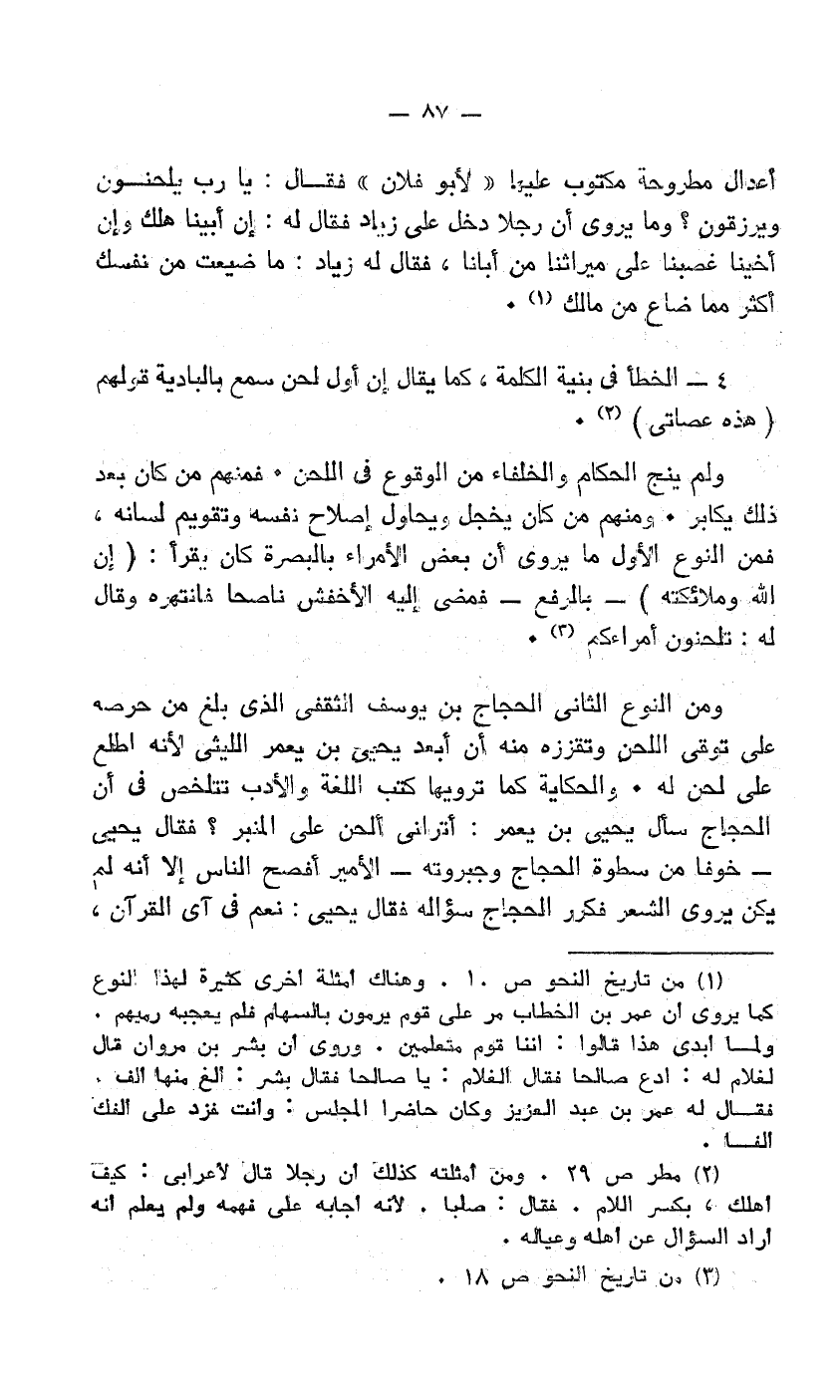 1 من تاريخ النحو ص10. وهناك أمثلة أخرى كثيرة لهذا النوع كما يروى أن عمر بن الخطاب مر على قوم يرمون بالسهام فلم يعجبه رميهم. ولما أبدى هذا قالوا: إننا قوم متعلمين. وروي أن بشر بن مروان قال لغلام له: ادع صالحًا فقال الغلام: يا صالحًا، فقال بشر: ألغ منها ألف. فقال له عمر بن عبد العزيز وكان حاضرًا المجلس: وأنت فزد على ألفك ألفًا.