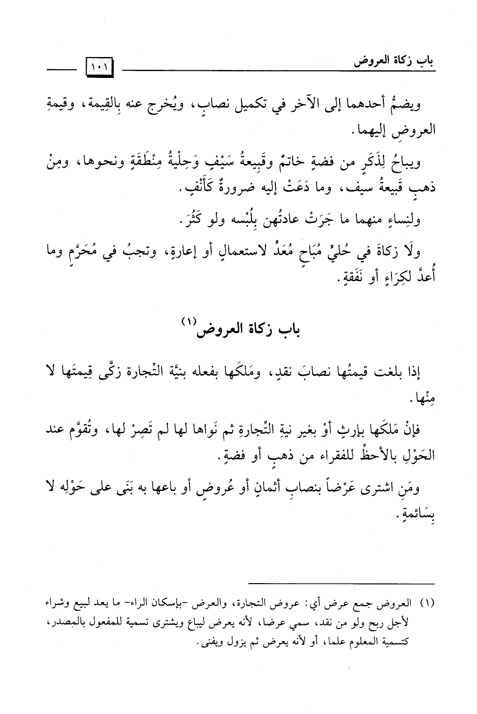 (¬1) العروض جمع عرض أي: عروض التجارة، والعرض -بإسكان الراء- ما يعد لبيع وشراء لأجل ربح ولو من نقد، سمي عرضا، لأنه يعرض ليباع ويشترى تسمية للمفعول بالمصدر، كتسمية المعلوم علما، أو لأنه يعرض ثم يزول ويفنى.