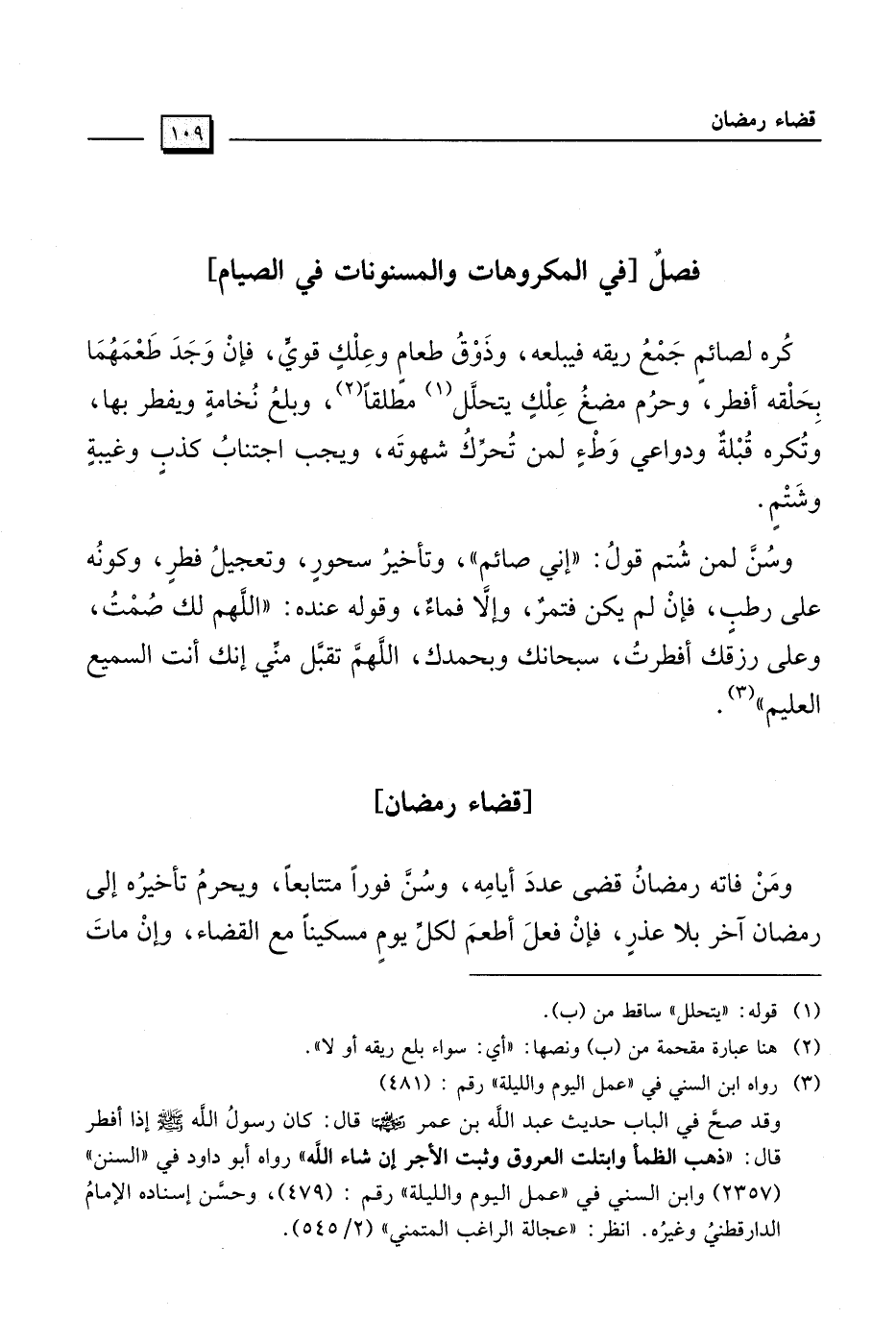 وسُنَّ لمن شُتم قولُ: "إني صائم"، وتأخيرُ سحورٍ، وتعجيلُ فطرٍ، وكونُه على رطبٍ، فإنْ لم يكن فتمرٌ، وإلاَّ فماءٌ، وقوله عنده: "اللَّهم لك صُمْتُ، وعلى رزقك أفطرتُ، سبحانك وبحمدك، اللَّهمَّ تقبَّل منِّي إنك أنت السميع العليم" (¬3).