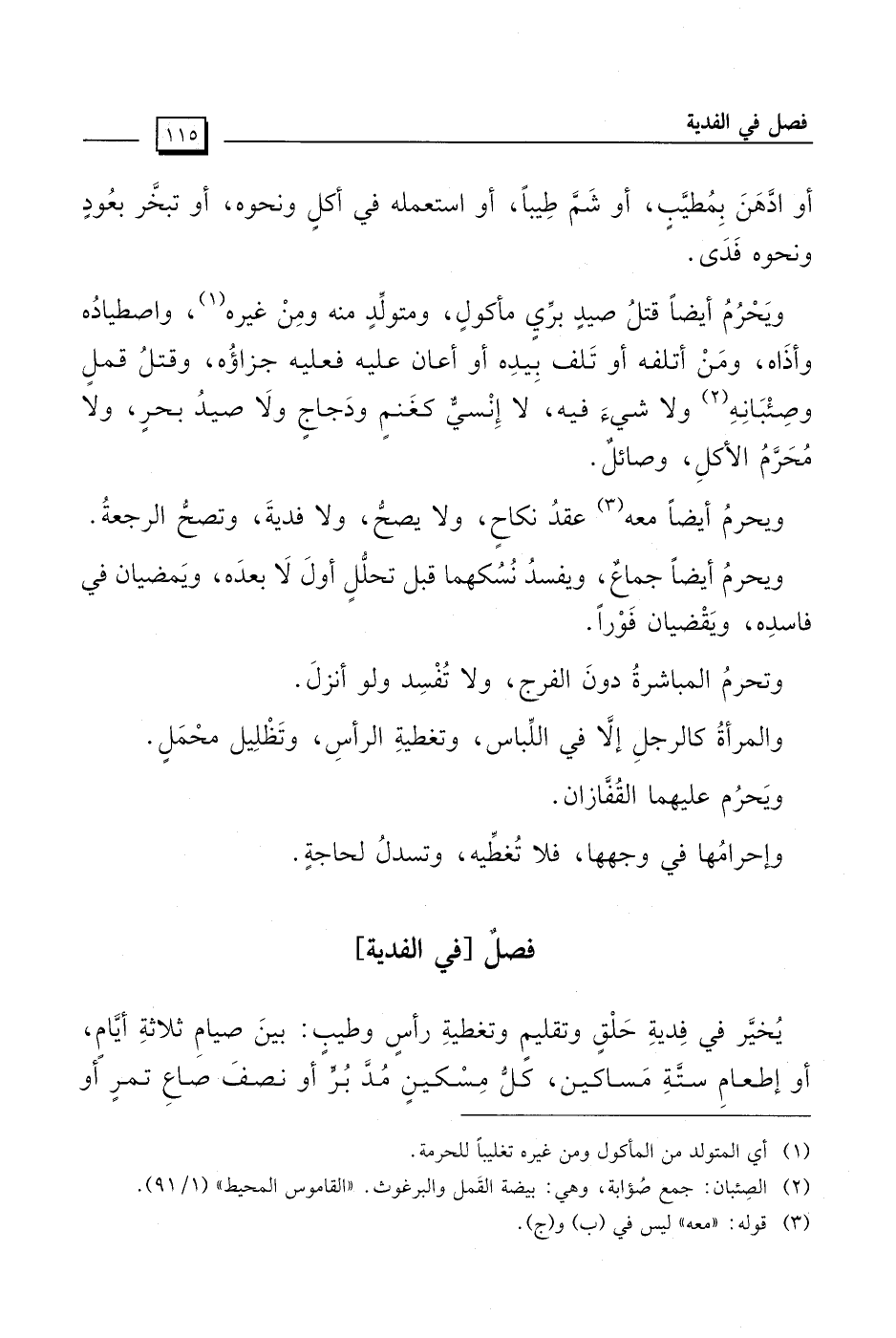 يُخيَّر في فِديةِ حَلْقٍ وتقليمٍ وتغطيةِ رأسٍ وطيبٍ: بينَ صيامِ ثلاثةِ أيَّام، أو إطعامِ ستَّةِ مَساكين، كلُّ مِسْكينٍ مُدَّ بُرٍّ أو نصفَ صاعِ تمرٍ أو