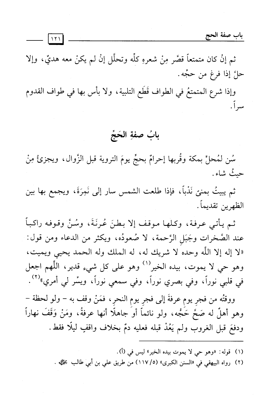ثم يأتي عرفة، وكلها موقف إلا بطنَ عُرنَةَ، وسُنَّ وقوفه راكبًا عند الصَّخرات وجَبَلِ الرَّحمة، لا صُعودُه، ويكثر من الدعاء ومن قول: "لا إله إلا الله وحده لا شريك له، له الملك وله الحمد يحيي ويميت، وهو حي لا يموت، بيده الخير (¬1) وهو على كل شيء قدير، اللَّهم اجعل في قلبي نورًا، وفي بصري نورًا، وفي سمعي نورًا، ويسِّر لي أمري" (¬2).