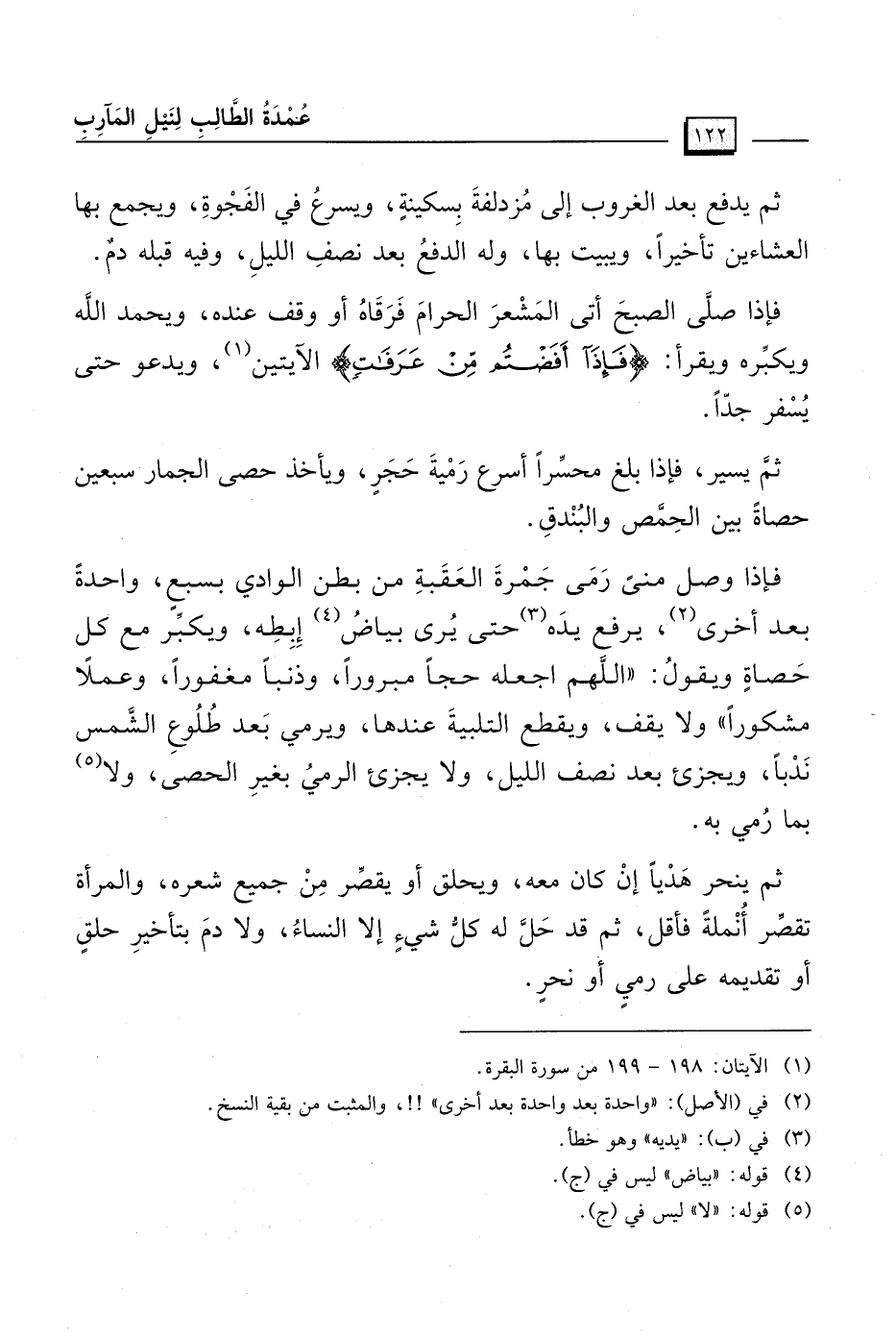 ثمَّ يسير، فإذا بلغ محسِّرًا أسرع رَمْيةَ حَجَرٍ، ويأخذ حصى الجمار سبعين حصاةً بين الحِمَّص والبُنْدقِ.