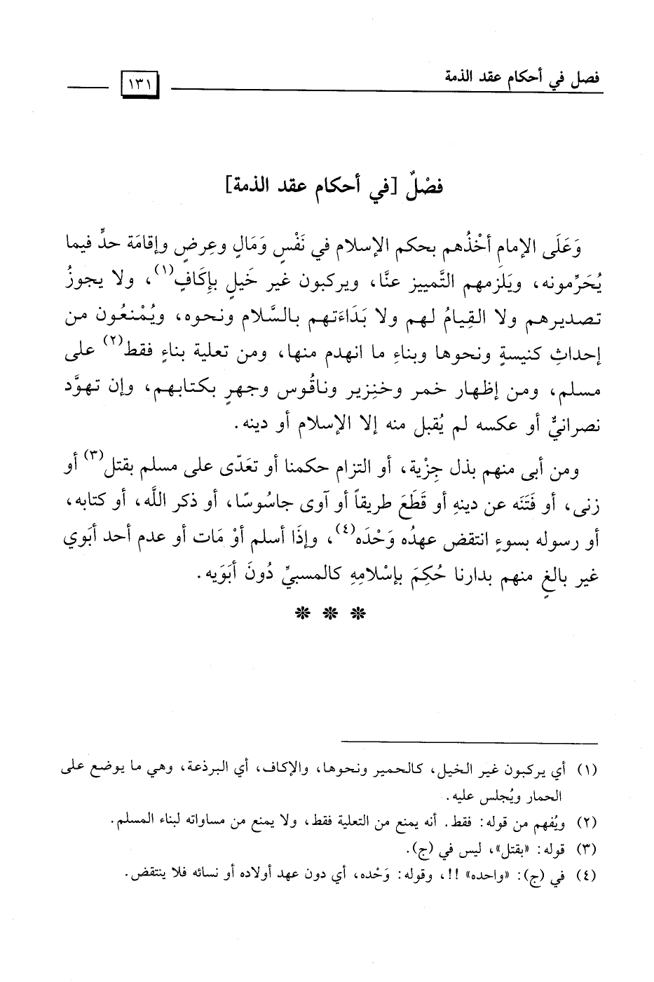 وَعَلَى الإمامِ أخْذُهم بحكم الإسلام في نَفْسٍ وَمَالٍ وعِرضٍ وإقامَة حدٍّ فيما يُحَرّمونه، ويَلزمهم التَّمييز عنَّا، ويركبون غير خَيلٍ بإِكَافٍ (¬1)، ولا يجوزُ تصديرهم ولا القِيامُ لهم ولا بَدَاءَتهم بالسَّلام ونحوه، ويُمْنعُون من إحداثِ كنيسةٍ ونحوها وبناءِ ما انهدم منها، ومن تعلية بناءٍ فقط (¬2) على مسلم، ومن إظهار خمر وخنِزير وناقُوس وجهرٍ بكتابهم، وإن تهوَّد نصرانيٌّ أو عكسه لم يُقبل منه إلا الإسلام أو دينه.