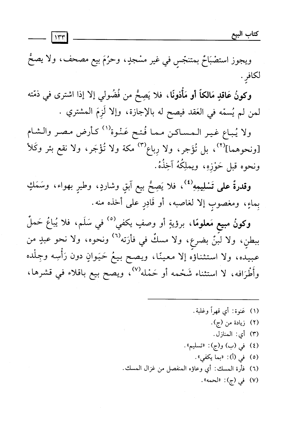 وكونُ مبيعٍ مَعلومًا، برؤيةٍ أو وصفٍ يكفي (¬5) في سَلَم، فلا يُباعُ حَملٌ ببطنٍ، ولا لبنٌ بضرع، ولا مسكٌ في فأرَته (¬6) ونحوه، ولا نحو عبدٍ من عبيده، ولا استثناؤه إلا معينًا، ويصح بيعُ حَيَوانٍ دون رَأْسه وجِلْده وأَطْرَافه، لا استثناء شَحْمه أو حَمْله (¬7)، ويصح بيع باقلاء في قشرها،