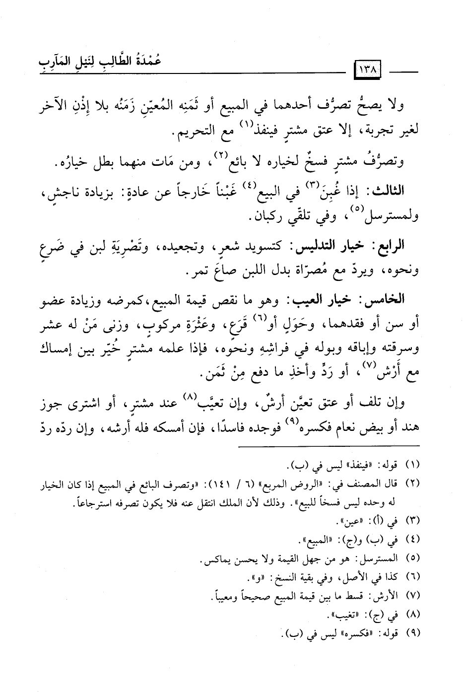 الخامس: خيار العيب: وهو ما نقص قيمة المبيع، كمرضه وزيادة عضو أو سنن أو فقدهما، وحَوَلٍ أو (¬6) قَرَعٍ، وعَثْرَةِ مركوبٍ، وزنى مَنْ له عشر وسرقته وإباقه وبوله في فراشهِ ونحوه، فإذا علمه مشترٍ خُيّر بين إمساك مع أَرْش (¬7)، أو رَدِّ وأخذِ ما دفع مِنْ ثَمَن.