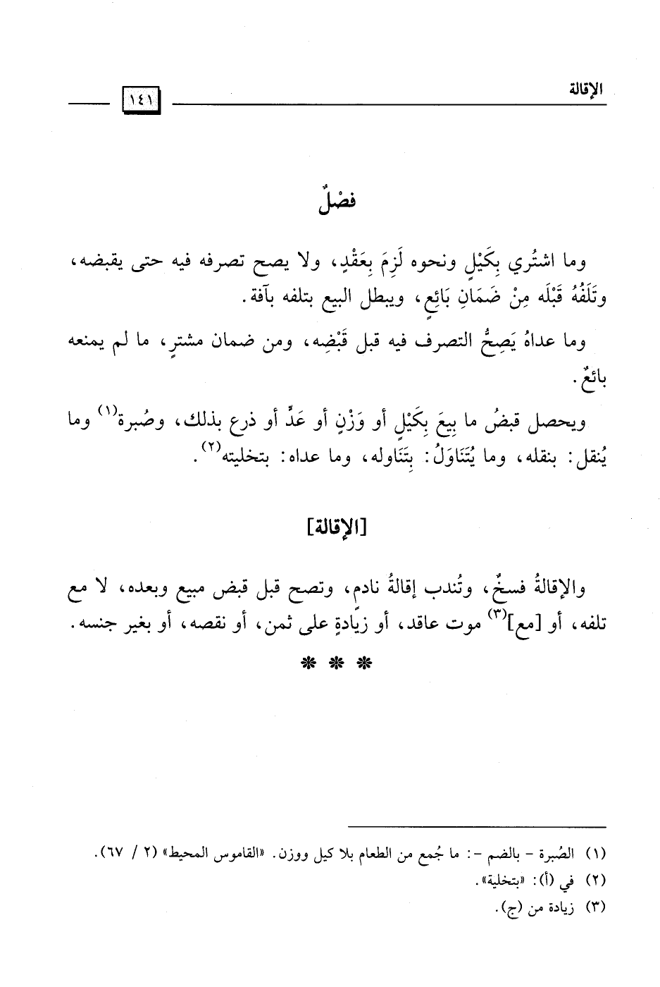 والإقالةُ فسخٌ، وتُندب إقالةُ نادمٍ، وتصح قبل قبض مبيع وبعده، لا مع تلفه، أو [مع] (¬3) موت عاقد، أو زيادةٍ على ثمن، أو نقصه، أو بغير جنسه.