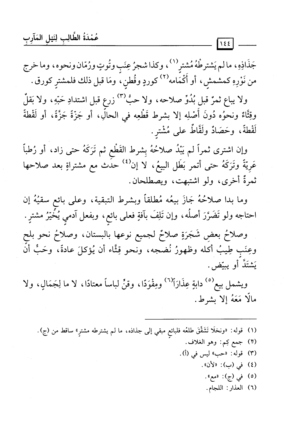 وصلاحُ بعضِ شَجَرَةٍ صلاح لجميع نوعها بالبستان، وصلاحُ نحو بلحٍ وعِنَب طِيبُ أكله وظهورُ نُضجه، ونحو قِثَّاء أن يُؤكلَ عادةً، وحَبٌّ أن يَشتَدَّ أو يبيّض.