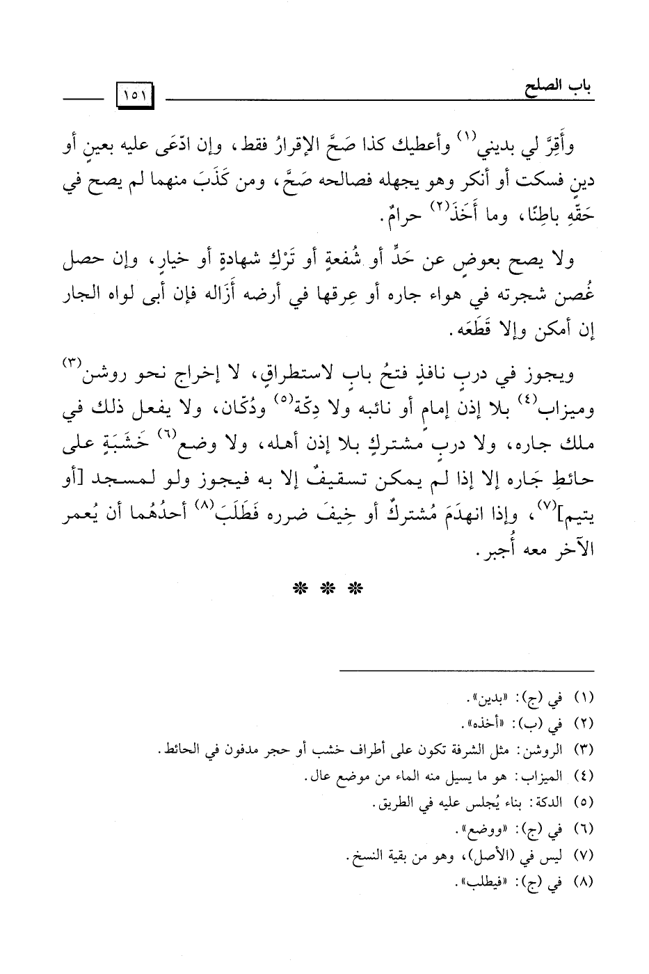 ويجوز في دربٍ نافذٍ فتحُ بابٍ لإستطراقٍ، لا إخراج نحو روشن (¬3) وميزاب (¬4) بلا إذن إمامٍ أو نائبه ولا دِكّة (¬5) ودُكّان، ولا يفعل ذلك في ملك جاره، ولا دربٍ مشتركٍ بلا إذن أهله، ولا وضع (¬6) خشَبَةٍ على حائطِ جَاره إلا إذا لم يمكن تسقيفٌ إلا به فيجوز ولو لمسجد [أو يتيم] (¬7)، وإذا انهدَمَ مُشتركٌ أو خِيفَ ضرره فَطَلَبَ (¬8) أحدُهُما أن يُعمر الآخر معه أُجبر.
