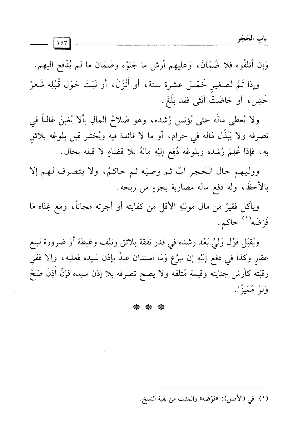 ولا يُعطى مالَه حتى يُؤنس رُشده، وهو صلاحُ المالِ بألا يُغبنَ غالباً في تصرفه ولا يَبْذُل مَاله في حرام، أو ما لا فائدة فيه ويُختبر قبل بلوغه بلائقٍ بهِ، فإذا عُلِمَ رُشده وبلوغه دُفِع إليْهِ مالهُ بلا قضاءٍ لا قبله بحال.