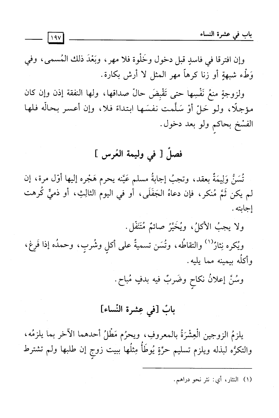 تُسَنُّ وَلِيمَةٌ بعقد، وتجبُ إجابةُ مسلم عَيَّنه يحرم هَجْره إليها أوّل مرة، إن لم يكن ثَمَّ مُنكر، فإن دعاهُ الجَفَلَى، أو في اليوم الثالِثِ، أو ذميٌّ كُرهت إجابته.
