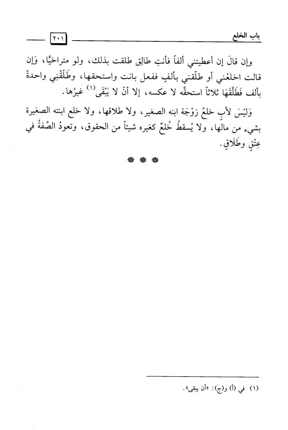 وَليْسَ لأبٍ خلعُ زوْجَة ابنه الصغير، ولا طلاقها، ولا خلع ابنته الصغيرة بشيء من مالها، ولا يُسقطُ خُلعٌ كغيره شيئاً من الحقوق، وتعودُ الصِّفةُ في عِتْقٍ وطَلَاقٍ.