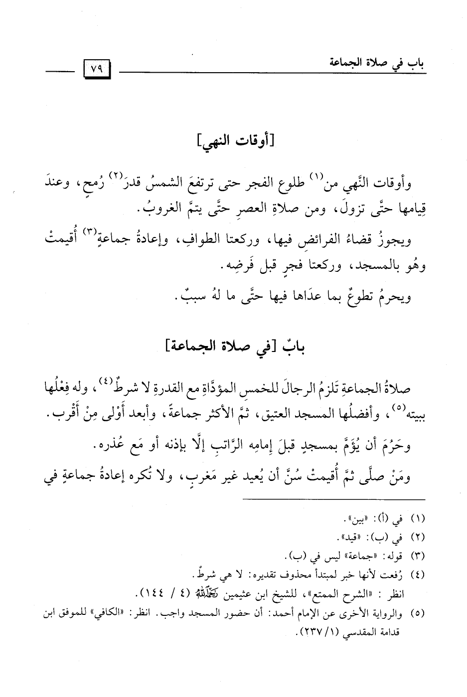 صلاةُ الجماعةِ تَلزمُ الرجالَ للخمسِ المؤدَّاةِ مع القدرةِ لا شرطٌ (¬4)، وله فِعْلُها ببيته (¬5)، وأفضلُها المسجد العتيق، ثمَّ الأكثر جماعةً، وأبعد أَوْلى مِنْ أَقْرب.