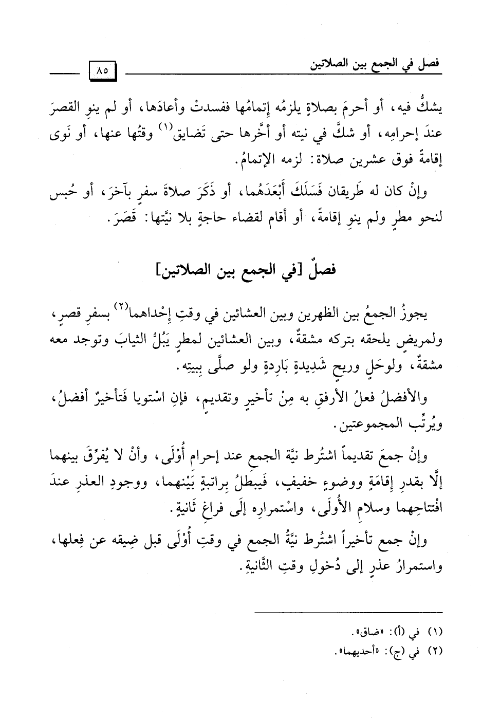 وإنْ جمعَ تقديمًا اشتُرط نيَّة الجمعِ عند إحرامِ أُوْلَى، وأنْ لا يُفرِّقَ بينهما إلَّا بقدرِ إِقامَةٍ ووضوءٍ خفيفٍ، فَيبطلُ بِراتبةٍ بَيْنهما، ووجودِ العذرِ عندَ افْتتاحِهما وسلامِ الأُولَى، واسْتمرارِه إلَى فراغِ ثَانيةٍ.