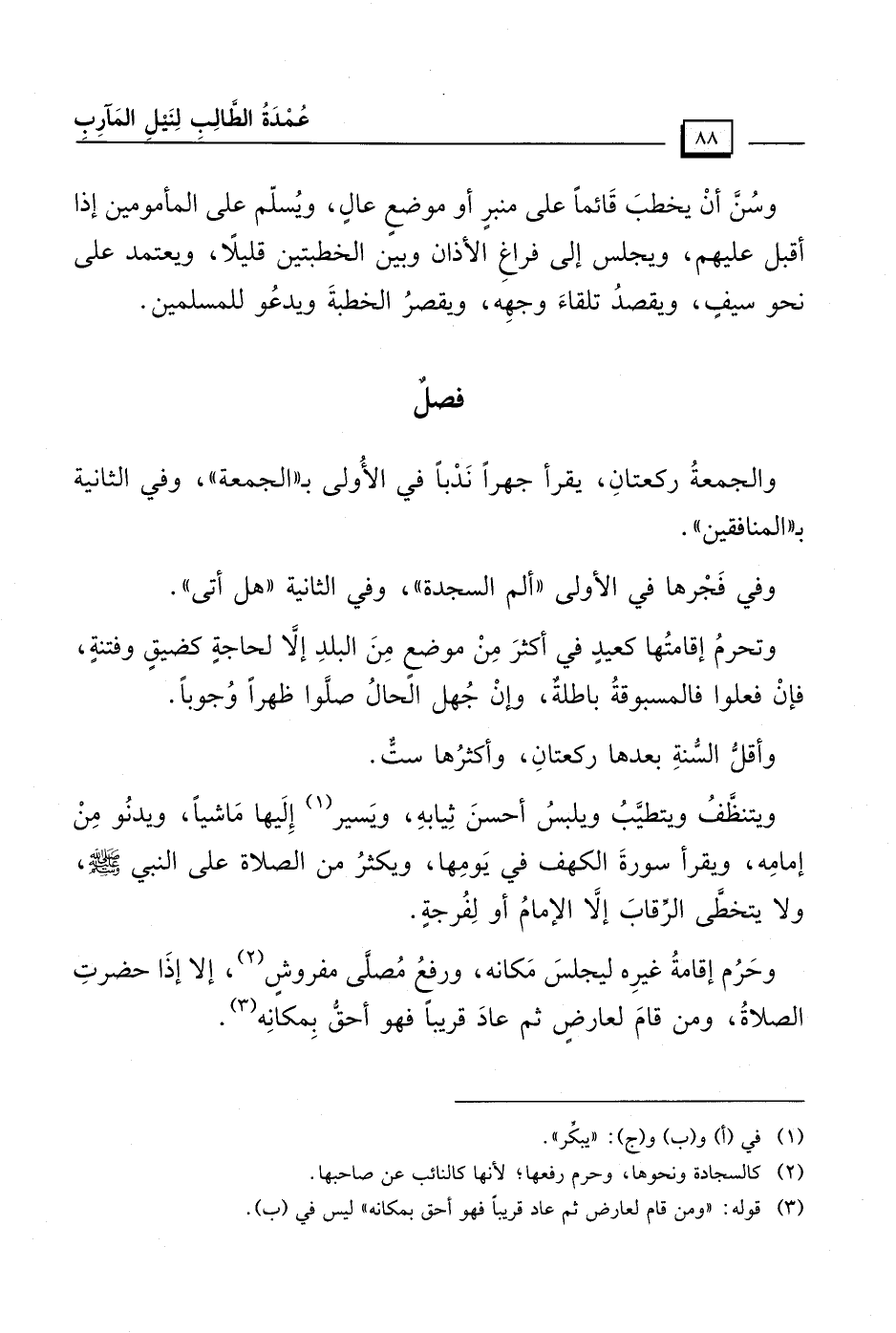 وسُنَّ أنْ يخطبَ قَائمًا على منبرٍ أو موضعٍ عالٍ، ويُسلّم على المأمومين إذا أقبل عليهم، ويجلس إلى فراغِ الأذان وبين الخطبتين قليلًا، ويعتمد على نحو سيفٍ، ويقصدُ تلقاءَ وجهِه، ويقصرُ الخطبةَ ويدعُو للمسلمين.