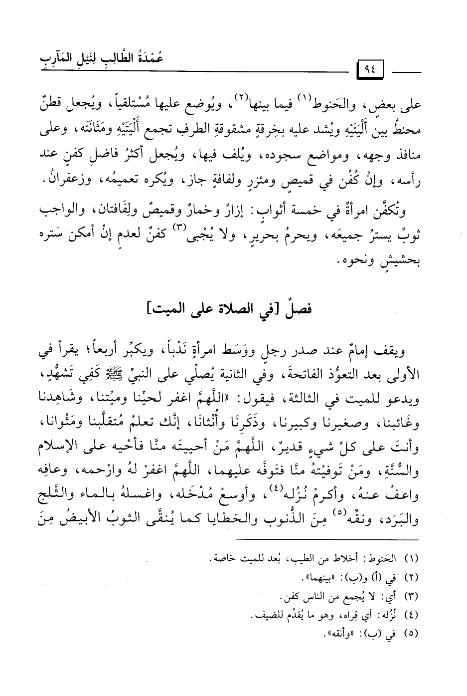 ويقف إمامٌ عند صدر رجلٍ ووَسَط امرأةٍ نَدْبًا، ويكبِّر أربعًا؛ يقرأ في الأولى بعد التعوُّذ الفاتحةَ، وفي الثانية يُصلِّي على النبيِّ - صلى الله عليه وسلم - كَفِي تَشهُّدٍ، ويدعو للميت في الثالثة، فيقول: "اللَّهمَّ اغفر لحيِّنا وميِّتنا، وشَاهِدنا وغَائبنا، وصغيرنا وكبيرنا، وذَكَرِنَا وأُنْثانَا، إنَّك تعلمُ مُتقلَّبنا ومَثْوانا، وأنتَ على كلِّ شيءٍ قديرٌ، اللَّهمَّ مَنْ أحييتَه منَّا فأحْيه على الإسلام والسُّنَّةِ، ومَنْ تَوفيْتهُ منَّا فتَوفَّه عليهما، اللَّهمَّ اغفرْ لهُ وارْحمه، وعافِه واعفُ عنهُ، وأكرمْ نُزُله (¬4)، وأوسعْ مُدْخَله، واغسلهُ بالماء والثَّلج والبَرَد، ونقِّه (¬5) مِنَ الذُّنوب والخطايا كما يُنقَّى الثوبُ الأبيضُ مِنَ