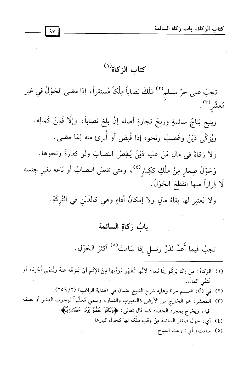 (¬1) الزكاةُ: مِنْ زكَا يَزكُو إذَا نَما؛ لأنَّها تُطهِّر مُؤدِّيها مِنَ الإِثْمِ أيْ تُنزهِّه عنهُ وتُنمِّي أَجْرهُ، أو تُنمِّي المالَ.