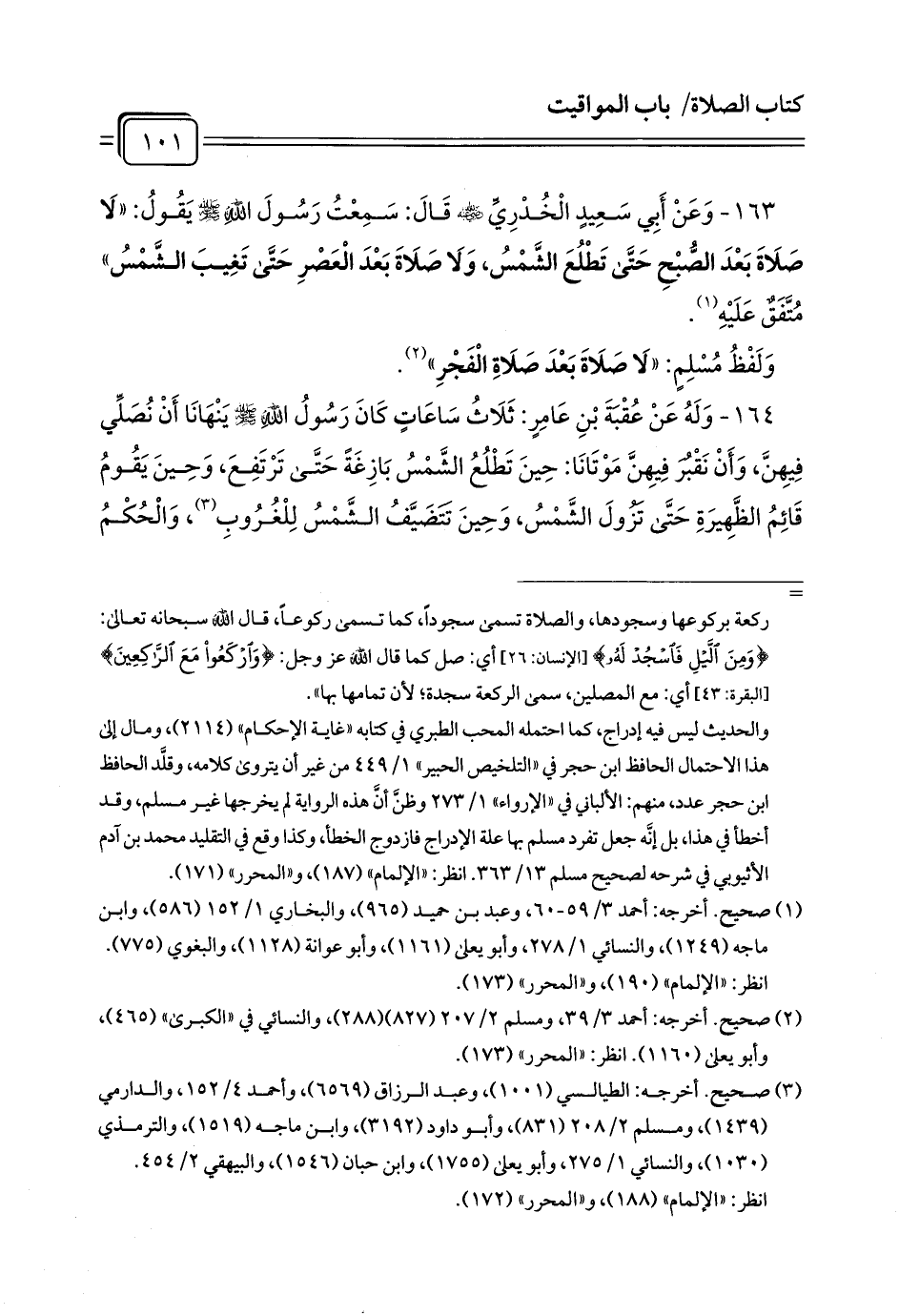 163 - وَعَنْ أَبِي سَعِيدٍ الْخُدْرِيِّ - رضي الله عنه - قَالَ: سَمِعْتُ رَسُولَ اللَّهِ - صلى الله عليه وسلم - يَقُولُ: «لَا صَلَاةَ بَعْدَ الصُّبْحِ حَتَّى تَطْلُعَ الشَّمْسُ، وَلَا صَلَاةَ بَعْدَ الْعَصْرِ حَتَّى تَغِيبَ الشَّمْسُ» مُتَّفَقٌ عَلَيْهِ (¬1).