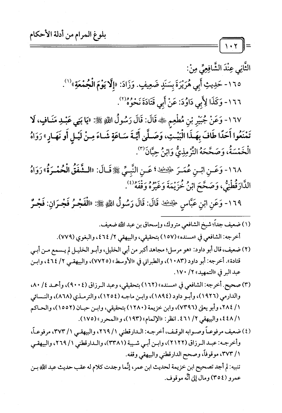 167 - وَعَنْ جُبَيْرِ بْنِ مُطْعِمٍ - رضي الله عنه - قَالَ: قَالَ رَسُولُ اللَّهِ - صلى الله عليه وسلم -: «يَا بَنِي عَبْدِ مَنَافٍ, لَا تَمْنَعُوا أَحَدًا طَافَ بِهَذَا الْبَيْتِ، وَصَلَّى أَيَّةَ سَاعَةٍ شَاءَ مِنْ لَيْلٍ أَو نَهَارٍ» رَوَاهُ الْخَمْسَةُ, وَصَحَّحَهُ التِّرْمِذِيُّ وَابْنُ حِبَّانَ (¬1).