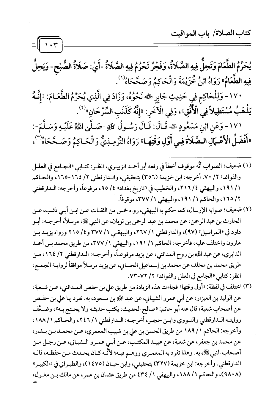 171 - وَعَنِ ابْنِ مَسْعُودٍ - رضي الله عنه - قَالَ: قَالَ رَسُولُ اللَّهِ - صلى الله عليه وسلم -: «أَفْضَلُ الْأَعْمَالِ الصَّلَاةُ فِي أَوَّلِ وَقْتِهَا» رَوَاهُ التِّرْمِذِيُّ وَالْحَاكِمُ وَصَحَّحَاهُ (¬1)،