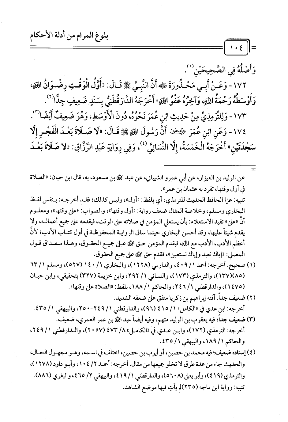 174 - وَعَنِ ابْنِ عُمَرَ رَضِيَ اللَّهُ عَنْهُمَا أَنَّ رَسُولَ اللَّهِ - صلى الله عليه وسلم - قَالَ: «لَا صَلَاةَ بَعْدَ الْفَجْرِ إِلَّا سَجْدَتَيْنِ» أَخْرَجَهُ الْخَمْسَةُ, إِلَّا النَّسَائِيَّ (¬1)،