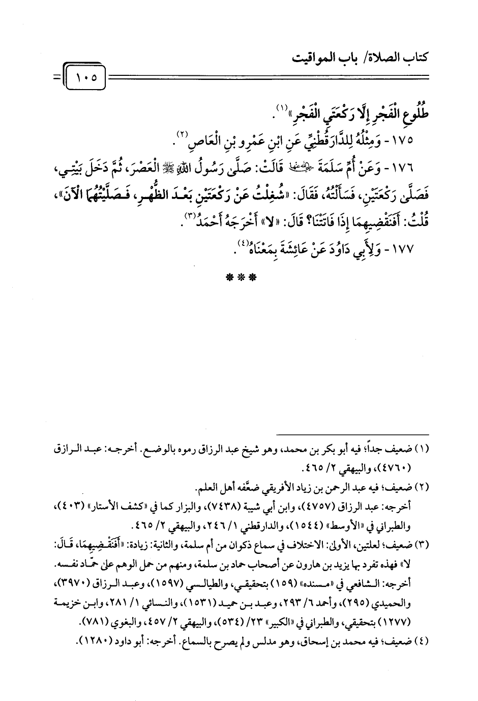 176 - وَعَنْ أُمِّ سَلَمَةَ رَضِيَ اللَّهُ عَنْهَا قَالَتْ: صَلَّى رَسُولُ اللَّهِ - صلى الله عليه وسلم - الْعَصْرَ, ثُمَّ دَخَلَ بَيْتِي, فَصَلَّى رَكْعَتَيْنِ, فَسَأَلْتُهُ, فَقَالَ: «شُغِلْتُ عَنْ رَكْعَتَيْنِ بَعْدَ الظُّهْرِ, فَصَلَّيْتُهُمَا الْآنَ» , قُلْتُ: أَفَنَقْضِيهِمَا إِذَا فَاتَتْنَا? قَالَ: «لا» أَخْرَجَهُ أَحْمَدُ (¬1).