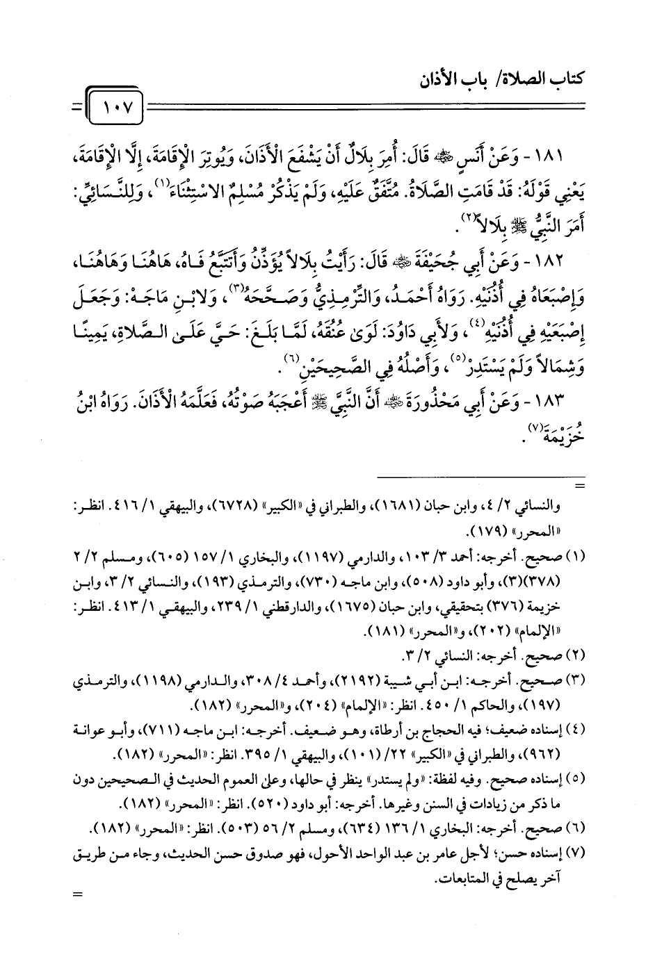 181 - وَعَنْ أَنَسٍ - رضي الله عنه - قَالَ: أُمِرَ بِلَالٌ أَنْ يَشْفَعَ الْأَذَانَ, وَيُوتِرَ الْإِقَامَةَ, إِلَّا الْإِقَامَةَ, يَعْنِي قَوْلَهُ: قَدْ قَامَتِ الصَّلَاةُ. مُتَّفَقٌ عَلَيْهِ, وَلَمْ يَذْكُرْ مُسْلِمٌ الاسْتِثْنَاءَ (¬1)، وَلِلنَّسَائِيِّ: أَمَرَ النَّبِيُّ - صلى الله عليه وسلم - بِلَالاً (¬2).