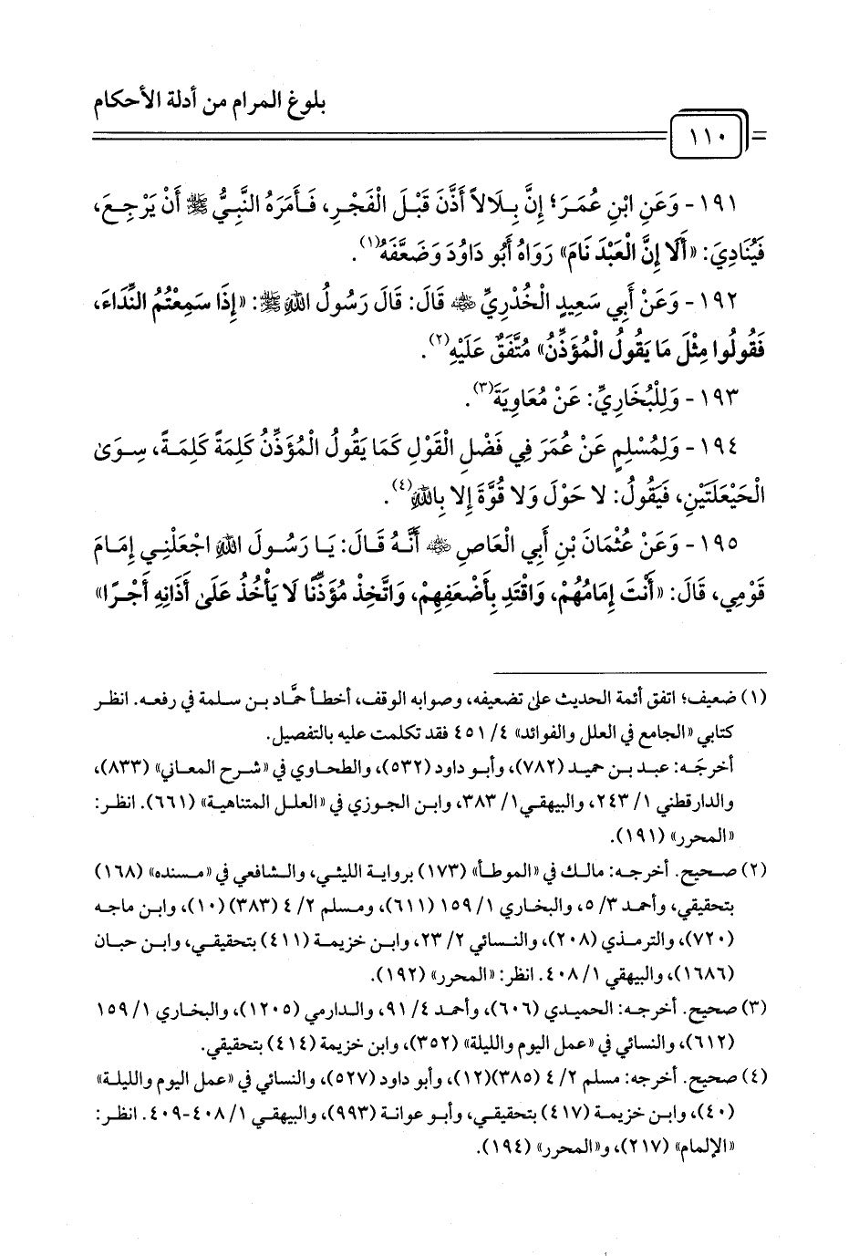 191 - وَعَنِ ابْنِ عُمَرَ; إِنَّ بِلَالاً أَذَّنَ قَبْلَ الْفَجْرِ, فَأَمَرَهُ النَّبِيُّ - صلى الله عليه وسلم - أَنْ يَرْجِعَ, فَيُنَادِيَ: «أَلَا إِنَّ الْعَبْدَ نَامَ» رَوَاهُ أَبُو دَاوُدَ وَضَعَّفَهُ (¬1).