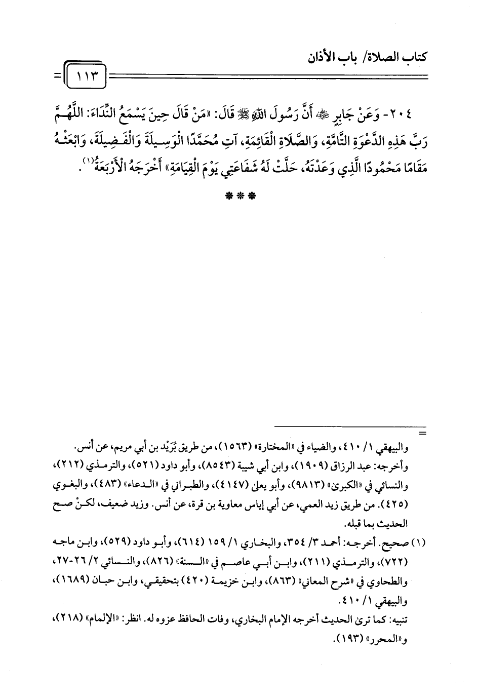 204 - وَعَنْ جَابِرٍ - رضي الله عنه - أَنَّ رَسُولَ اللَّهِ - صلى الله عليه وسلم - قَالَ: «مَنْ قَالَ حِينَ يَسْمَعُ النِّدَاءَ: اللَّهُمَّ رَبَّ هَذِهِ الدَّعْوَةِ التَّامَّةِ، وَالصَّلَاةِ الْقَائِمَةِ، آتِ مُحَمَّدًا الْوَسِيلَةَ وَالْفَضِيلَةَ، وَابْعَثْهُ مَقَامًا مَحْمُودًا الَّذِي وَعَدْتَهُ، حَلَّتْ لَهُ شَفَاعَتِي يَوْمَ الْقِيَامَةِ» أَخْرَجَهُ الْأَرْبَعَةُ (¬1).
