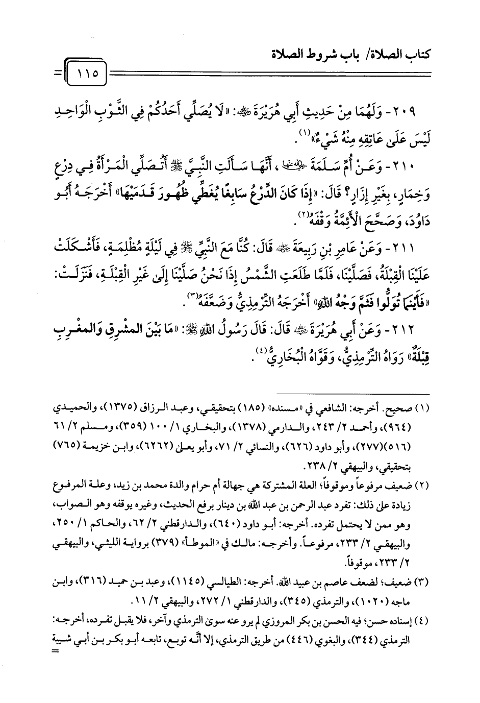 209 - وَلَهُمَا مِنْ حَدِيثِ أَبِي هُرَيْرَةَ - رضي الله عنه -: «لَا يُصَلِّي أَحَدُكُمْ فِي الثَّوْبِ الْوَاحِدِ لَيْسَ عَلَى عَاتِقِهِ مِنْهُ شَيْءٌ» (¬1).
