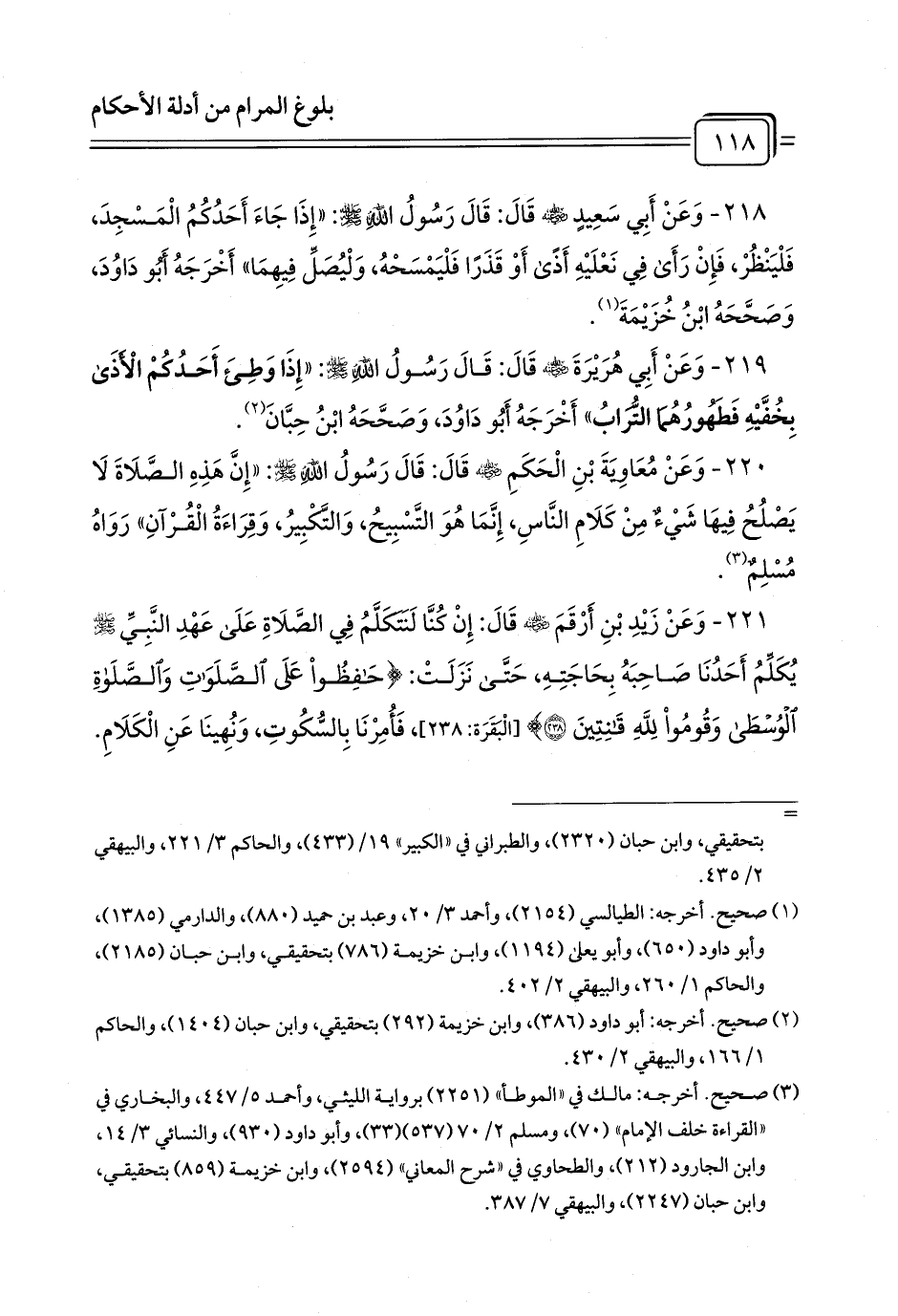218 - وَعَنْ أَبِي سَعِيدٍ - رضي الله عنه - قَالَ: قَالَ رَسُولُ اللَّهِ - صلى الله عليه وسلم -: «إِذَا جَاءَ أَحَدُكُمُ الْمَسْجِدَ، فَلْيَنْظُرْ، فَإِنْ رَأَى فِي نَعْلَيْهِ أَذًى أَوْ قَذَرًا فَلْيَمْسَحْهُ، وَلْيُصَلِّ فِيهِمَا» أَخْرَجَهُ أَبُو دَاوُدَ، وَصَحَّحَهُ ابْنُ خُزَيْمَةَ (¬1).