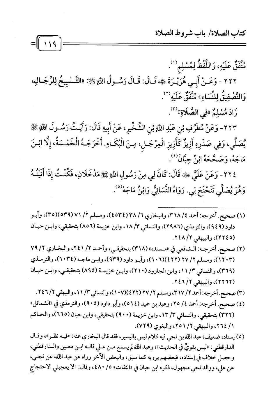 223 - وَعَنْ مُطَرِّفِ بْنِ عَبْدِ اللَّهِ بْنِ الشِّخِّيرِ، عَنْ أَبِيهِ قَالَ: رَأَيْتُ رَسُولَ اللَّهِ - صلى الله عليه وسلم - يُصَلِّي، وَفِي صَدْرِهِ أَزِيزٌ كَأَزِيزِ الْمِرْجَلِ، مِنَ الْبُكَاءِ. أَخْرَجَهُ الْخَمْسَةُ، إِلَّا ابْنَ مَاجَهْ، وَصَحَّحَهُ ابْنُ حِبَّانَ (¬1).