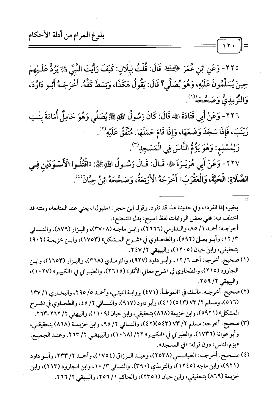 227 - وَعَنْ أَبِي هُرَيْرَةَ - رضي الله عنه - قَالَ: قَالَ رَسُولُ اللَّهِ - صلى الله عليه وسلم -: «اقْتُلُوا الْأَسْوَدَيْنِ فِي الصَّلَاةِ: الْحَيَّةَ، وَالْعَقْرَبَ» أَخْرَجَهُ الْأَرْبَعَةُ، وَصَحَّحَهُ ابْنُ حِبَّانَ (¬1).