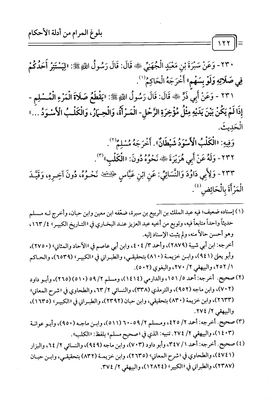 231 - وَعَنْ أَبِي ذَرٍّ - رضي الله عنه - قَالَ: قَالَ رَسُولُ اللَّهِ - صلى الله عليه وسلم -: «يَقْطَعُ صَلَاةَ الْمَرْءِ الْمُسْلِمِ -إِذَا لَمْ يَكُنْ بَيْنَ يَدَيْهِ مِثْلُ مُؤْخِرَةِ الرَّحْلِ- الْمَرْأَةُ، وَالْحِمَارُ، وَالْكَلْبُ الْأَسْوَدُ ...» الْحَدِيثَ.